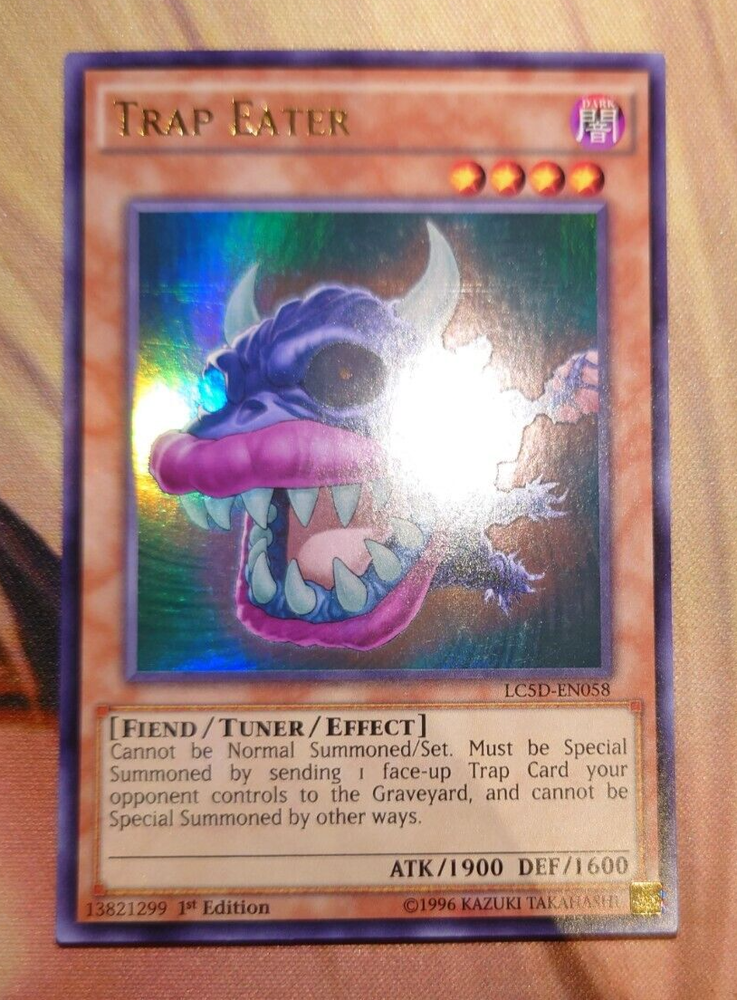 This Yu-Gi-Oh! TCG card is a must-have for any collector or player. The Trap Eater card from the Legendary Collection 5D's set is an Ultra Rare card with a 1st Edition feature. It is a Tuner card with the Card Number Lc5d-En058 and belongs to the Fiend creature/monster type. The card has a Dark colour attribute and belongs to the CCG Individual Cards and Collectable Card Games categories. It has a defence/toughness of 1600 and an attack/power of 1900. This card is perfect for anyone looking to add a rare and powerful card to their collection.