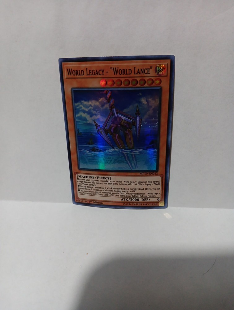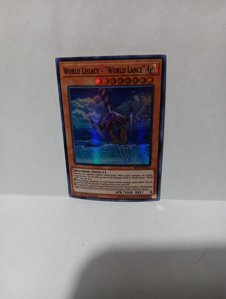 This Yu-Gi-Oh! TCG card is a must-have for any fan. The World Legacy - "World Lance" card from the 2019 Gold Sarcophagus Tin Mega Pack is a rare find. With a powerful attack of 3000 and a defense of 0, this Machine type creature is a force to be reckoned with. The card is lightly played (excellent) and is a first edition. It has not been graded but is in great condition. Perfect for collectors or players looking to strengthen their deck. Don't miss out on the opportunity to add this Super Rare card to your collection.