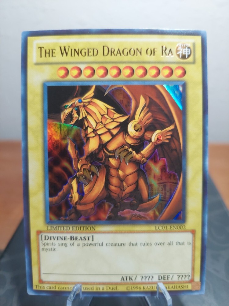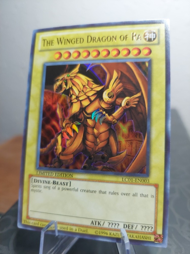 This Yu-Gi-Oh! card is a limited edition ultra rare card from the Yu-Gi-Oh Legendary Collection 1 set. The card features the Divine-Beast creature type, with a Defense/Toughness of 0 and an Attack/Power of 0. It is made from card stock material and has a holo finish. The card number is LC01-EN003 and it is in English language. The winged dragon of Ra is a Japanese-sized card and is not autographed. It is perfect for collectors and players of the Yu-Gi-Oh! TCG game. The card is manufactured by Konami in the United States and is not vintage. Get your hands on this highly sought-after card today!