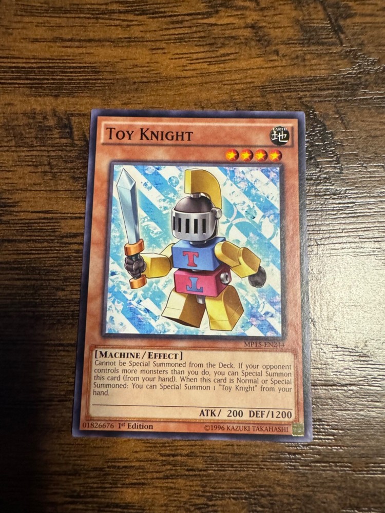 This Yu-Gi-Oh! Toy Knight card is a must-have for collectors and players alike. With a rare 1st edition status, it's a valuable addition to any collection. The card features an Earth element, machine creature type, and an attack power of 200. It's a common/short print card from the 2015 Mega-Tins Mega Pack set, manufactured by Konami. The card is in English language and has a defense/toughness of 1200. It's an effect type card with card number MP15-EN244. Perfect for fans of the Yu-Gi-Oh! TCG game.