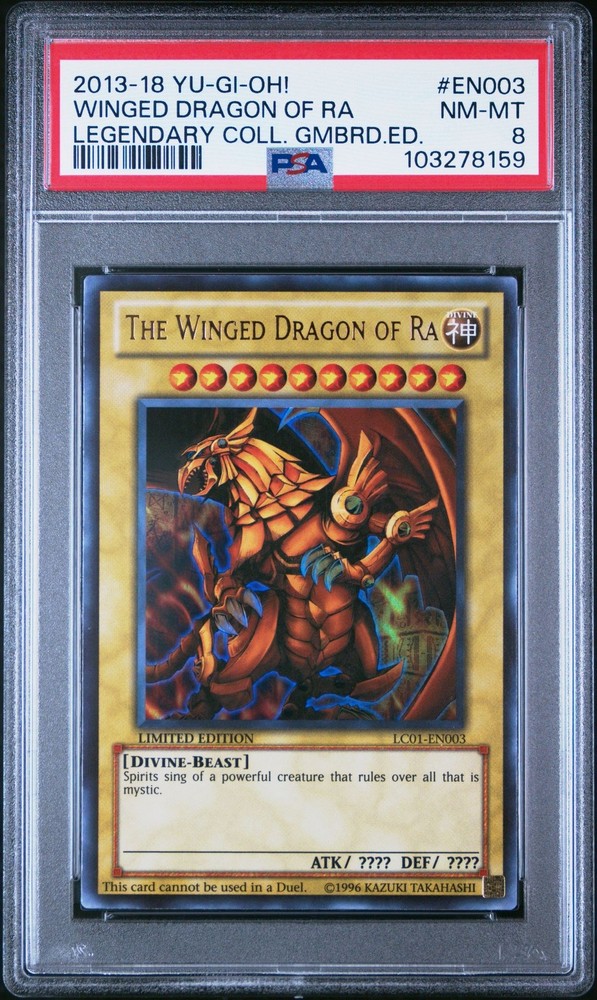 Yu-Gi-Oh! - Winged Dragon of Ra 2013-18 LC01-EN003 Limited Edition PSA 8 Yu-Gi-Oh! - Winged Dragon of Ra 2013-18 LC01-EN003 Limited Edition PSA 8 Yu-Gi-Oh! - Legendary Collection Gameboard Edition Winged Dragon of Ra 2013-18 LC01-EN003 Limited Edition PSA 8 Details Set: Legendary Collection Gameboard Edition Card: Winged Dragon of Ra Number: LC01-EN003 Manufacturer: Yu-Gi-Oh! Year: 2013-18 Variation: Limited Edition Graded: PSA 8 Notes: Images on listing are scans of actual card you will receive, please use photos to determine condition. Card will be stored and shipped in a protective toploader. We sell collectible merchandise, with conditions ranging from used, vintage to brand new. We do our best to accurately describe the features and condition of each item. Due to the nature of these products, the item and/or original packaging may have handling wear, aging, etc. Please carefully review the description and photos to evaluate the condition of the item to ensure it meets your expectations prior to purchase. We do not use stock images , each photo on this listing is of the actual item for sale. We do offer combined shipping for multiple items going to the same address. Of course, feel free to ask us any questions you may have! Thank you for shopping with us. Please visit our eBay store to check out our other collectible items! Welcome Shipping Returns Thanks for stopping by our store! We appreciate the opportunity to earn your positive feedback and share our unique collection with you! If you have any concerns, please contact us immediately so we can assist you. We are very responsive and happy to assist. Here at Back in the Day, we are pleased to share our collection of vintage and modern collectibles with you. From classic movie, music and gaming memorabilia to pop culture toys and so much more, take home a piece of nostalgia from our ever-changing stockroom. Be sure to browse all our categories frequently so you don't miss out on that rare find! Shipping Speed We are proud to provide fast service to our customers; your order will be shipped within 1 business day of placing your order. On average, domestic First Class/Ground Advantage packages arrive in 5-7 business days (depending on destination). On average, domestic Priority packages arrive in 3-5 business days (depending on destination). On average, FedEx Ground/Home packages arrive in 2-6 business days. We observe all government holidays. We cannot guarantee delivery dates. Packaging We take care in packaging each order - you can rest assured that your items will be thoughtfully packaged to minimize risk and arrive safely to you. Combined Shipping We're happy to combine shipping for multiple items going to the same address.* Multiple items should auto-combine in your cart, but if not, you can request an invoice with combined shipping. We will choose the lowest cost shipping option during fulfillment meeting all carrier weight and policy requirements. *We are unable to combine shipping on auction orders for separate auctions (auctions ending on different dates). Orders must be paid within four days from auction end, or will be cancelled. Additional Once we ship your order, we will provide you tracking information. If you do not receive your shipment within 11 business days of placing your order, feel free to contact us and we’ll be happy to investigate it further. If an item is returned to us due to an incorrect or incomplete address entered during purchase, the buyer is responsible for paying shipping cost if they want the item resent. If the item will not be resent, the buyer will be issued a refund for the cost of the item, not the cost of shipping paid. Please review your shipping details to ensure successful delivery. Please also note that the shipping rates for items we sell are weight-based. We will choose the most cost-efficient delivery method for your order based on weight and size. To reflect the policies of the shipping companies we use, all weights will be rounded up to the nearest pound or ounce, depending on the carrier requirements. We are always available if you have questions! We value your business. Just let us know what you need help with and we will respond quickly. If an item is damaged in shipping, we will be happy to help. Please contact us with your order number and details, including pictures of the damaged item within 30 days of purchase. Due to the nature of the products we sell, and the fact that many are vintage and not new merchandise, items are not eligible for return without reasonable cause. Please take care in reviewing product descriptions and photos before placing your order to be fully aware of the condition of the item. Feel free to ask any questions you may have about an item and we will respond as soon as possible.