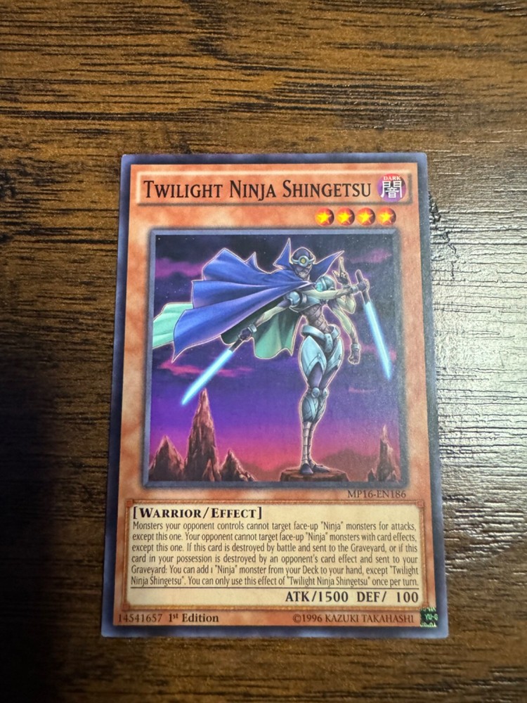 This Yu-Gi-Oh! Twilight Ninja Shingetsu card is a must-have for any collector or player. With a Dark color attribute and a Warrior creature/monster type, this card has a defense/toughness of 100 and an attack/power of 1500. It is a Common/Short Print rarity and comes from the 2016 Mega-Tins Mega Pack set. The card is in English language and manufactured by Konami. This 1st Edition card is an Effect type and has the card number MP16-EN186. It is perfect for any fan of the Yu-Gi-Oh! Trading Card Game. Add this card to your collection today and experience the thrill of the game.