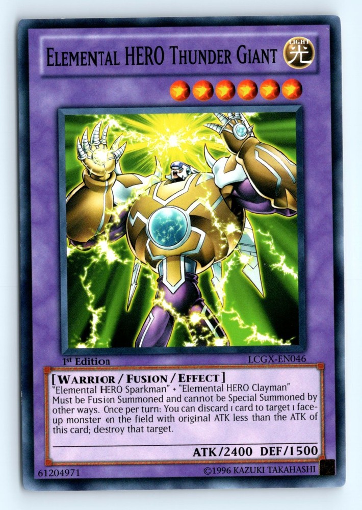 Cards 20$ or Less in Price Will be shipped in a penny sleeve and in a top loader or Semi Rigid card holder by Ebay standard envelope. Please check out the scans for a good look at the condition. This is a example of a Legendary Collection 2 #LCGX-EN046 Elemental HERO Thunder Giant . Please check out our other listings for more great cards.