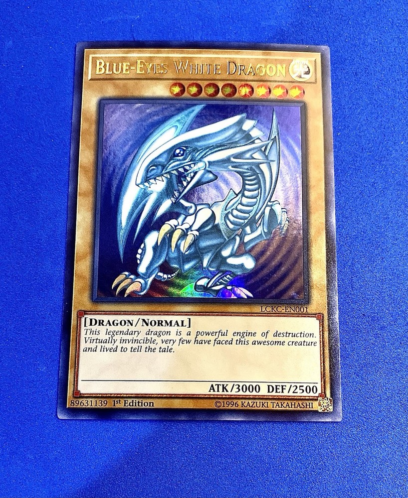 Elevate your Yu-Gi-Oh! TCG collection with the iconic Blue Eyes White Dragon card from the Legendary Collection Kaiba series. This ultra rare 1st edition card, with its unmistakable holographic finish, features the formidable Yami Yugi's signature monster, a Fiend-type creature that commands both respect and awe on the dueling field. Proudly manufactured by Konami and adhering to the standard Japanese card size, this English language card, LCKC-EN001, is a must-have for both seasoned collectors and aspiring duelists. Its sleek black attribute complements any deck theme, ensuring your card's striking appearance is matched only by its formidable Effect-type abilities in gameplay.