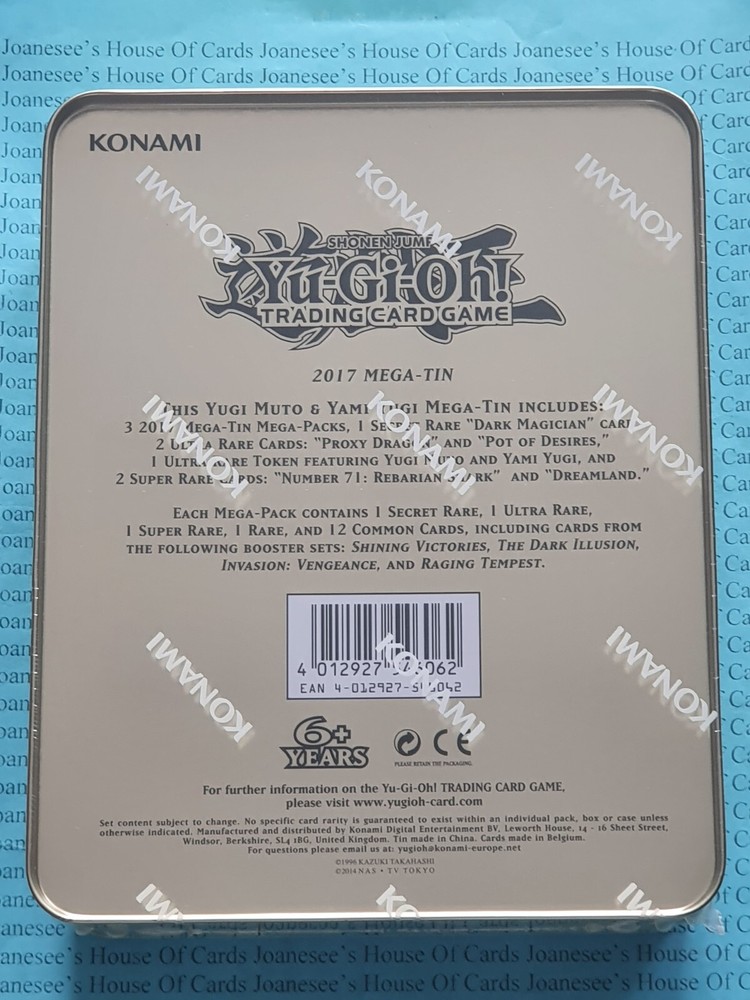 This is the 2017 Mega-Tin - Yugi Muto Each Mega-Tin contains the following: Three 16-card Mega Packs: Each Mega Pack contains cards from "Shining Victories", "The Dark Illusion", "Invasion: Vengeance", and "Raging Tempest": 1 Secret Rare 1 Ultra Rare 1 Super Rare 1 Rare 12 Commons 6 Promotional cards: 1 Secret Rare 3 Ultra Rares 2 Super Rares CT14-EN001 "Dark Magician" Secret Rare Normal Monster CT14-EN005 "Number 71: Rebarian Shark" Super Rare Effect Xyz Monster CT14-EN006 "Dreamland" Super Rare Field Spell CT14-EN007 "Token" Ultra Rare Token 1st Edition/Limited Edition English (EU Version) Mint/NMint Condition Totally Original Konami (or your money back!) I will deliver in safe packaging to keep it in perfect condition. Ideal for players and collectors alike. Check out my other items! I will combine postage costs for multiple purchases. Sign up for my email newsletters by adding my eBay Shop to your favourites