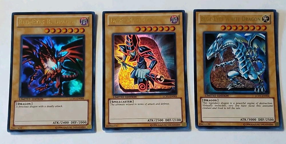 Available for purchase is a set of Red-Eyes B. Dragon, Dark Magician, and Blue-Eyes White Dragon limited edition ultra rare from the 10th anniversary binder edition. I am not a professional grader. I do combine shipping on multiple purchases.
