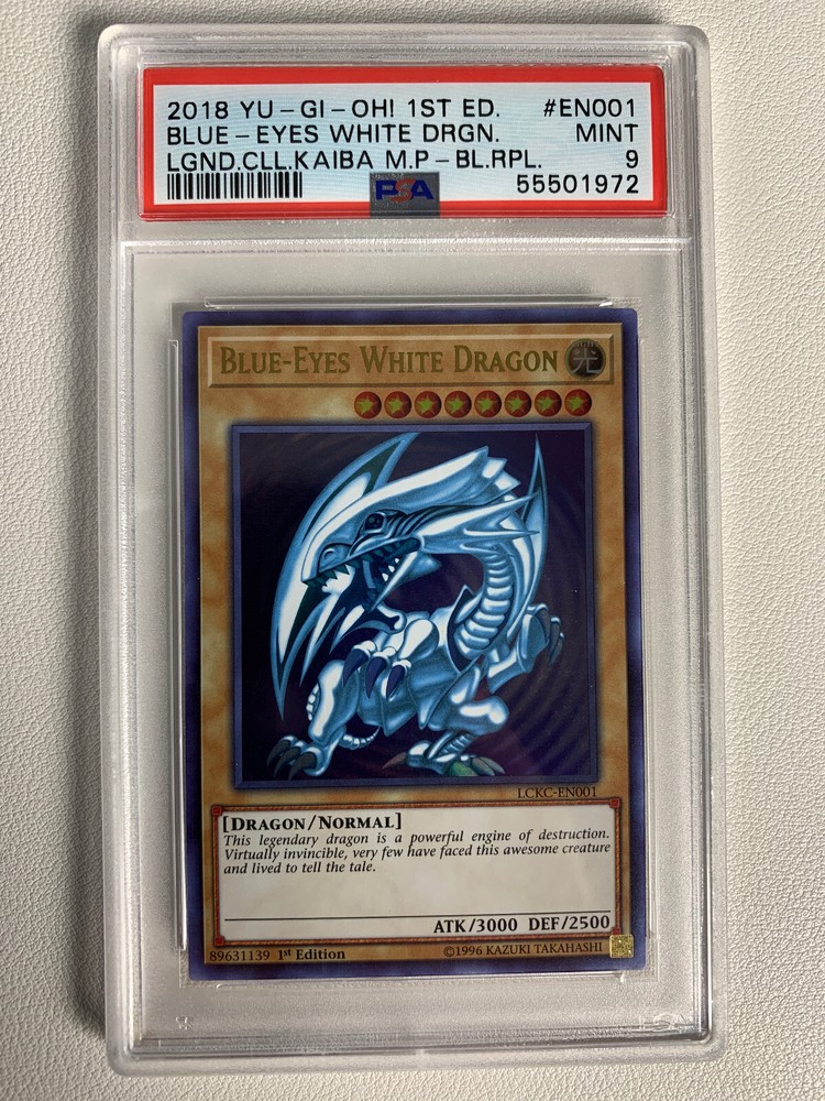 Elevate your Yu-Gi-Oh! TCG collection with the iconic Blue-Eyes White Dragon card, a must-have for enthusiasts and competitive players alike. This 2018 release, with card number LCKC-EN001, boasts the prestigious Ultra rarity and the coveted 1st Edition status, making it a standout addition. Featuring the classic white color scheme and a holographic finish that catches the eye, this card is a product of Konami's meticulous craftsmanship. Graded Mint 9 by the Professional Sports Authenticator (PSA), it ensures both premium quality and authenticity, preserving the card's pristine state for years to come.