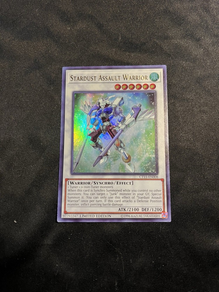 Elevate your Yu-Gi-Oh! collection with the Stardust Assault Warrior, a sought-after Ultra Rare card from the 2018 Mega-Tins set. Card number CT15-EN008, this piece is a must-have for players and collectors alike, offering not just strategic gameplay value but also a gem for your compendium. The Stardust Assault Warrior embodies the essence of the Yu-Gi-Oh! Collectible Card Game, representing a formidable addition to any deck. With its rarity and the prestige of being part of the 2018 Mega-Tins series, it's a standout choice for enthusiasts looking to enhance their game or preserve a piece of Yu-Gi-Oh! history.