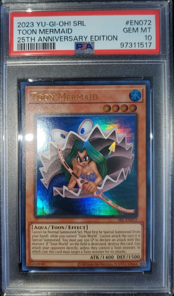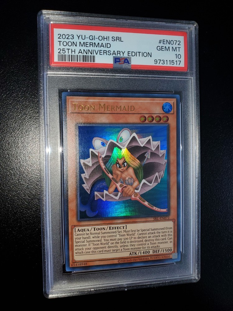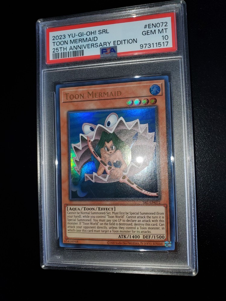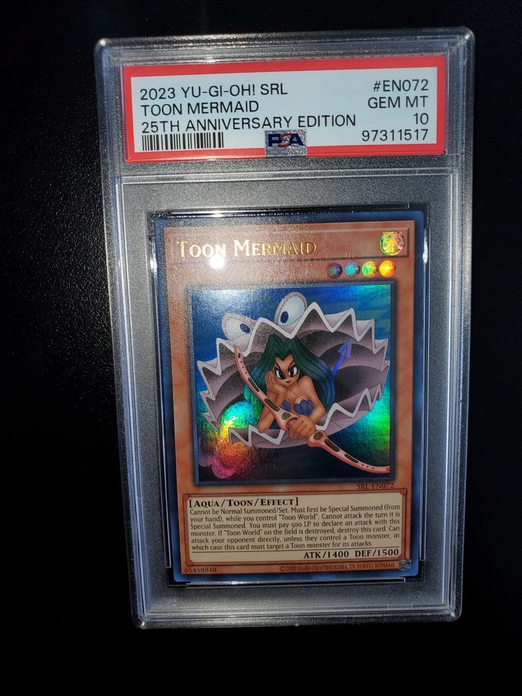 Yugioh 2023 Toon Mermaid SRL-EN072 PSA 10 Will ship safely & securely. Slab is fitted tight and firmly in a perfect fit plastic sleeve. Placed in small 4x6 bubble mailer that will be sandwiched in between 2 large cuts of cardboard. Further encased in a larger brighter 6x10 bubble mailer to ensure perfect protection during shipment and to retain visibility to USPS workers reducing the possibility of missing packages. As a long time seller on eBay, I want every order placed with me to arrive timely and safely. You are entrusting me with your hard earned money and I will not only meet, but surpass your trusted expectations. Feel free to message for further pictures or questions