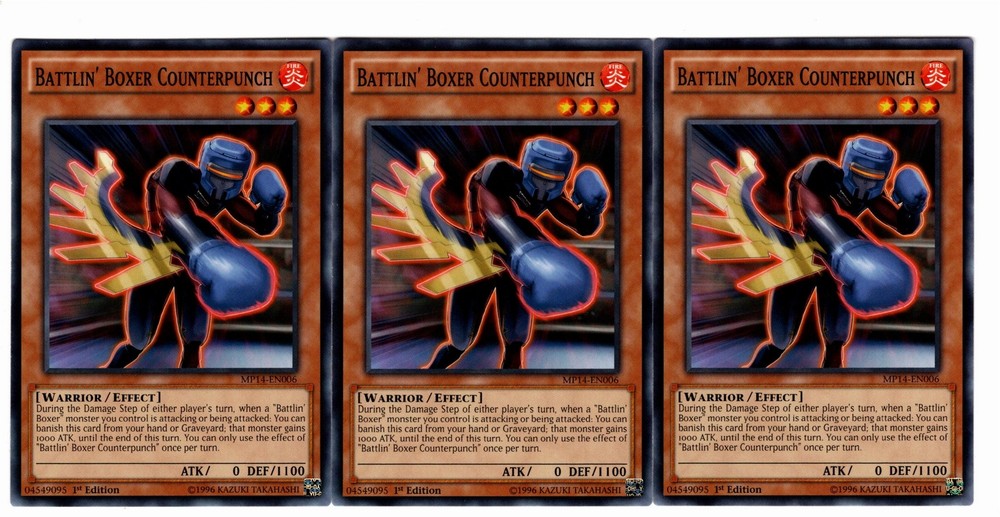 What's Included: Cds Card Name Rarity Edition Set Code Condition 3 Battlin' Boxer Counterpunch Common 1st Edition MP14-EN006 Near Mint Additional Comments: All Pictures are scans of actual product(s) Shipping/Feedback: International Shipping is handled by eBay. 100% Positive & 5 Star Feedback 3 Years Running. Orders Paid before 11 ET are shipped SAME DAY. Cards are shipped in penny sleeve(s) and toploader(s). Bubble Envelope and Tracking on Higher Cost Items. Card Grading: Grading cards is a subjective art form. I try to follow the TCGPlayer(Recently purchased by eBay) grading guide. Sometimes I will even put a grade like Very Light Play or Light to Moderate. The reason for that is because a card could be on the High or Low end of a Grade. Near Mint (NM) - Mostly clean card with very few flaws. Card should have clean corners with no wear but could have a tiny ding at a corner or edge. There could be some minor scuffing and scratches more so on the back. I am stricter regarding the front of the card. Keep in mind I even open fresh packs and get cards with scratches and corner dings. If you are a card collector message me if you have any questions. Especially for cards from older sets. Light Play (LP) - Cards will have some corner and/or edge wear. There could be a small bend but nothing major. There could also be some minor scuffing on the front. If I see more than a few dings, nicks and scratches I willl downgrade the card to Moderate Play. Moderate Play (MP) - Cards have a wide range of conditions. This could include cards that are very close to Light Play or close to Heavy Play. Expect some bends and/or a crease or two. I don't usually sell cards in this condition so it you want an exact grade please contact me. Heavy Play(HP) - What can I say. The card is a total wreck. Creases and heavy wear.