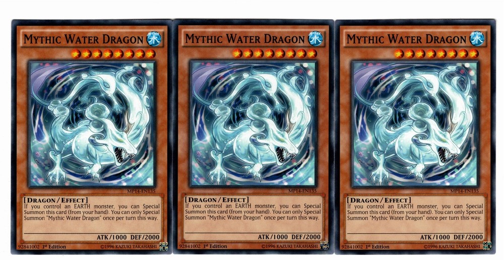 What's Included: Cds Card Name Rarity Edition Set Code Condition 3 Mythic Water Dragon Common 1st Edition MP14-EN135 Near Mint Additional Comments: All Pictures are scans of actual product(s) Shipping/Feedback: International Shipping is handled by eBay. 100% Positive & 5 Star Feedback 3 Years Running. Orders Paid before 11 ET are shipped SAME DAY. Cards are shipped in penny sleeve(s) and toploader(s). Bubble Envelope and Tracking on Higher Cost Items. Card Grading: Grading cards is a subjective art form. I try to follow the TCGPlayer(Recently purchased by eBay) grading guide. Sometimes I will even put a grade like Very Light Play or Light to Moderate. The reason for that is because a card could be on the High or Low end of a Grade. Near Mint (NM) - Mostly clean card with very few flaws. Card should have clean corners with no wear but could have a tiny ding at a corner or edge. There could be some minor scuffing and scratches more so on the back. I am stricter regarding the front of the card. Keep in mind I even open fresh packs and get cards with scratches and corner dings. If you are a card collector message me if you have any questions. Especially for cards from older sets. Light Play (LP) - Cards will have some corner and/or edge wear. There could be a small bend but nothing major. There could also be some minor scuffing on the front. If I see more than a few dings, nicks and scratches I willl downgrade the card to Moderate Play. Moderate Play (MP) - Cards have a wide range of conditions. This could include cards that are very close to Light Play or close to Heavy Play. Expect some bends and/or a crease or two. I don't usually sell cards in this condition so it you want an exact grade please contact me. Heavy Play(HP) - What can I say. The card is a total wreck. Creases and heavy wear.