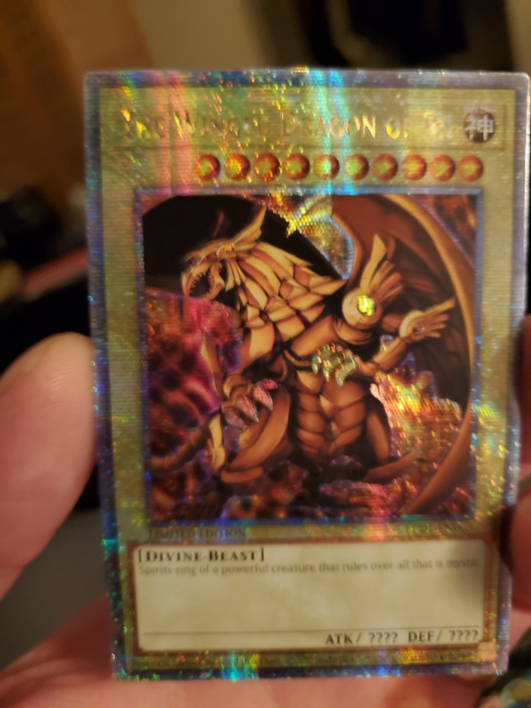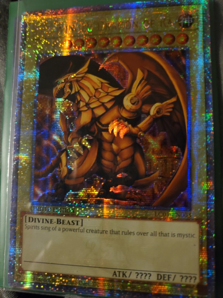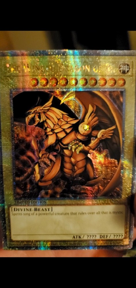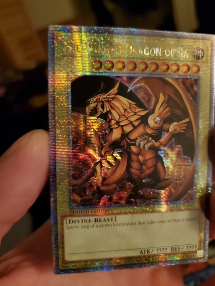 Experience the might of "The Winged Dragon of Ra" from the Legendary Collection: 25th Anniversary Edition, a treasure for any Yu-Gi-Oh! TCG enthusiast. This Ultra Rare card, boasting a Quarter Century Secret Rare status, is a standout with its holo surface effect that captures the eye. Its attributes reflect the original Konami design, ensuring authenticity and a high level of collectability. With the card numbered LC01-EN003, it is highly sought after for its powerful in-game abilities and impressive visual appeal. Proudly displaying the Original Yugioh Konami KP, it comes graded with a 9-10 rating, signifying its near mint or better condition. This piece is further enhanced by an autograph from Yugioh Konami, making it a truly unique addition to any collection.