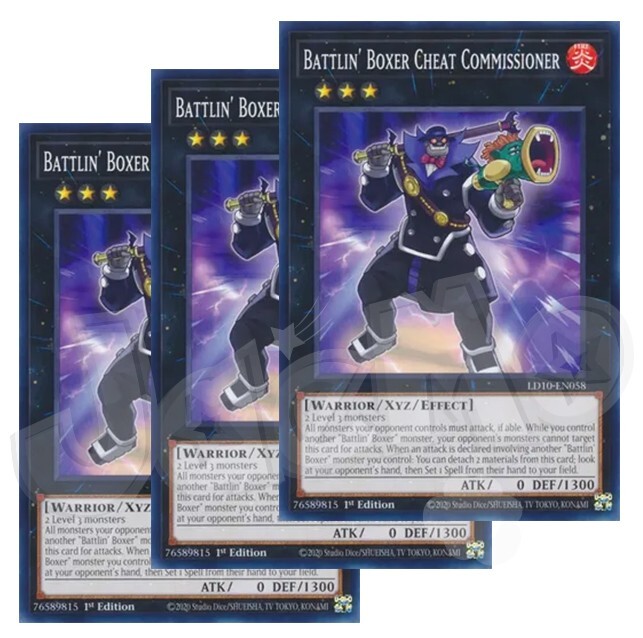 Battlin' Boxer Cheat Commissioner x 3 1st Edition The cards are in NM condition. Cards will be placed in a sleeve and top loader for security. Also will include a free Holographic card which can be Super, Ultra, Secret, etc! Card Information LD10-EN058 - 1st Edition Legendary Duelists: Soulburning Volcano