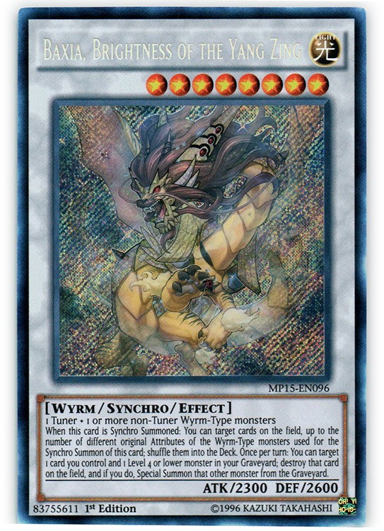 You are purchasing: Yugioh! Baxia, Brightness of the Yang Zing - MP15-EN096 - Secret Rare - 1st Edition Condition: Near Mint | Language: English All photos are stock, unless mentioned otherwise. Card edition, rarity, etc. is listed in the title and description. Items will be shipped within 1 business day upon receiving cleared payment. We ship Monday through Friday in order to get the item(s) to you as quickly as possible Before leaving neutral or negative feedback, please contact us beforehand so we can discuss the issue. Feel free to message me with any questions you have regarding this auction or my policies. Shipping Options: Non-Expedited Shipping - $0.99 Orders $24.99 (exc. sales tax) and under will be sent in a white envelope in a card saver + soft sleeve using eBay's Standard Envelope tracking service. Orders $30.00 (exc. sales tax) and over will be sent with free USPS tracking information w/ toploader + soft sleeve. Priority Mail - $9.99 2-3 Day shipping Orders will be shipped in a flat rate envelope in a toploader + soft sleeve. Priority Express Mail - $29.99 1-2 Day shipping Orders will be shipped in a flate rate envelope in a toploader + soft sleeve. *All orders over $100 will be sent with free insurance. All orders over $250 will be sent with free insurance and signature confirmation.* Card Grading: Near Mint (NM) - Cards with this grade will show minimal to no wear from shuffling, play or handling and can have a nearly unmarked surface, crisp corners and unblemished edges outside of a few minimal flaws. Holographic cards are more scrutinized than non-holo cards. Lightly Played (LP) - Cards with this grade may have a few dings, light playwear and/or edgewear. A few surface scratches are acceptable. A crease or bend is acceptable if it is less than approximately 1/2 inch in size and is only visible on one side. Moderately Played (MP) - Cards with this grade may have dings, playwear and/or edgwear, 1 or 2 creases or bends that do not go through the length of the card. Cards may have a 1 or 2 deep scratches. Heavily Played (HP) - Cards with this grade may have dings, playwear and/or edgwear, creases or bends that may go the length of the card, markings and/or coloring, tears on the edges. Despite being the lowest of grading, these cards are still tournament legal. If you receive a card not in the stated condition, please contact us to return the item for a full refund. Please note that card centering is not guaranteed nor is it a factor when we grade a card for condition. Thank you for buying.
