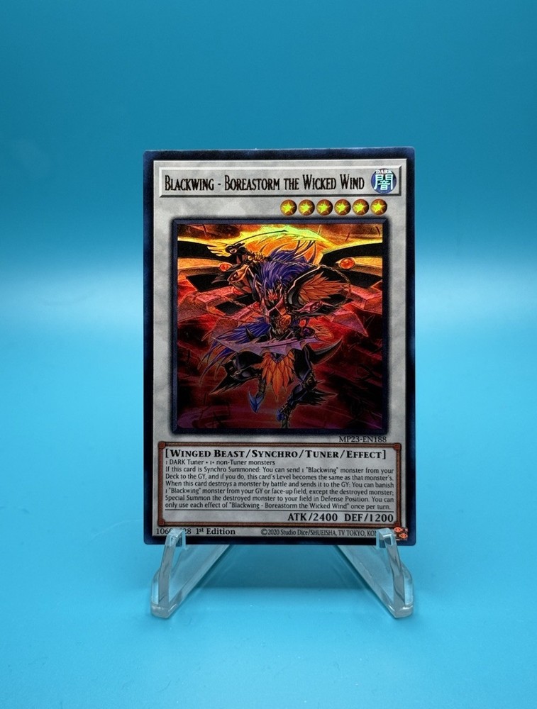 Elevate your Yu-Gi-Oh! TCG collection with the formidable Blackwing - Boreastorm the Wicked Wind card, a must-have for enthusiasts and competitive players alike. From the 25th Anniversary Tin: Dueling Heroes Mega Pack, this card boasts the Dark attribute and acts as an Effect Tuner Synchro, adding dynamic play to your deck. With an attack power of 2400 and a defense strength of 1600, it's a force to be reckoned with in the dueling arena. The Blackwing - Boreastorm the Wicked Wind card is an English-language, Ultra Rare gem with the card number MP23-EN188. As a 1st Edition piece by Konami, it holds a special place in the Yu-Gi-Oh! lore. Its Winged Beast creature type ensures it holds a prestigious place in the game's vast universe, making it a standout addition to any collection or strategy.