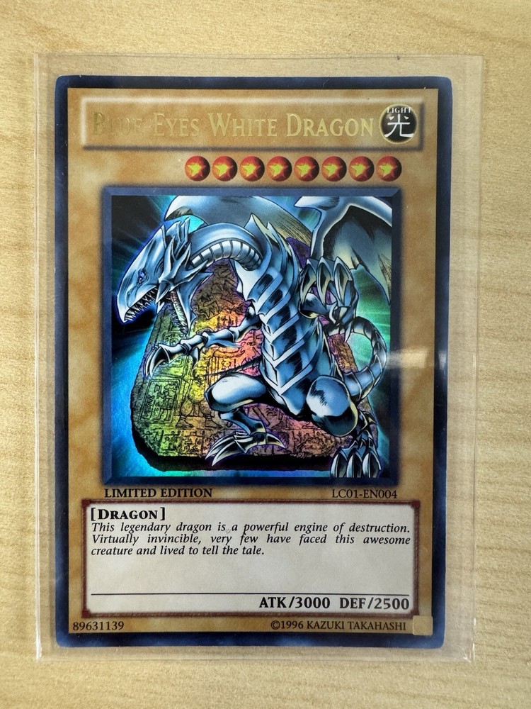 The product is a Yu-Gi-Oh! TCG card from the Legendary Collection set featuring the character Blue-Eyes White Dragon. It is an Ultra Rare 1st Edition card with card number LC01-EN004. The card is in English and made of card stock with a regular finish. It is manufactured by Konami and was released in 2023. The card is not autographed and is not graded.