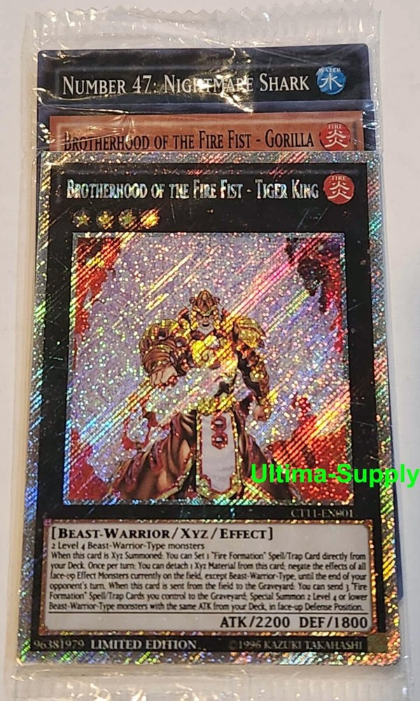 Brand new in factory sealed pack Yugioh Brotherhood Fire Fist Tiger King 2014 Mega Tin Promo 3 Cards Pack CT11 include CT11-EN001 "Brotherhood of the Fire Fist - Tiger King" CT11-EN003 "Brotherhood of the Fire Fist - Gorilla" CT11-EN004 "Number 47: Nightmare Shark" As always, all product are in Stock and Ready to be shipped Click here for our other product Shipping & Handling Allow up to 3 business days for handling time. Your order will be shipped 3-5 business days of receiving cleared Payment. We ship within the continental 48 U.S states by USPS or UPS, ship to Alaska, Hawaii, Puerto-Rico, Guam, Virgin Island, APO/FPO/DPO addresses may take longer, please email us 1st before your purchase International buyer please check shipping from ebay shipping calculator. We only ship to Confirm address and we also reserve the right to cancel any order at any for any reason