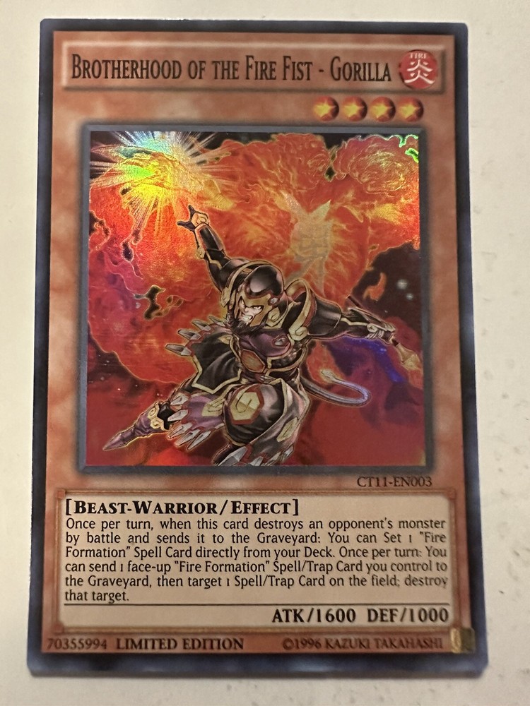 Yugioh! Brotherhood of the Fire Fist - Gorilla - CT11-EN003 - Super Rare - Limit. In great condition and check the photos for any flaws on the card. If you need any additional pictures of particular areas let me know! I will ship with extreme care! This is a great addition to your collection!