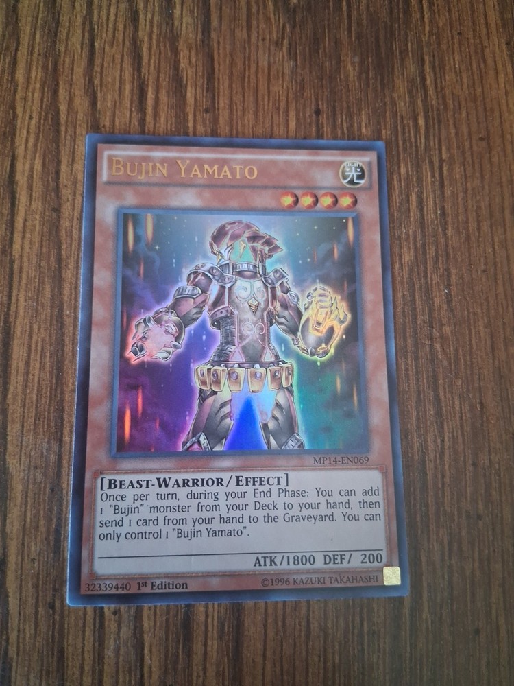 Elevate your Yu-Gi-Oh! TCG collection with the Bujin Yamato card, a powerful addition from the 2014 Mega-Tin Mega Pack - MP14 set. As a Rare card with a Holo finish, it stands out both in appearance and in gameplay, featuring the formidable Beast-Warrior creature type that can turn the tides in your favor. With its Effect card type, Bujin Yamato delivers impactful gameplay strategies that can give you the edge in battle. This 1st Edition collectible showcases the attribute of Light and comes with the card number MP14-EN069. Whether you're a seasoned player or a collector, the Bujin Yamato is a must-have for its blend of aesthetics and tactical advantage. Enhance your deck and make a statement at your next duel with this Ultra Rare card.