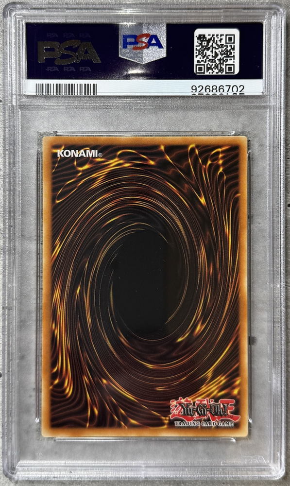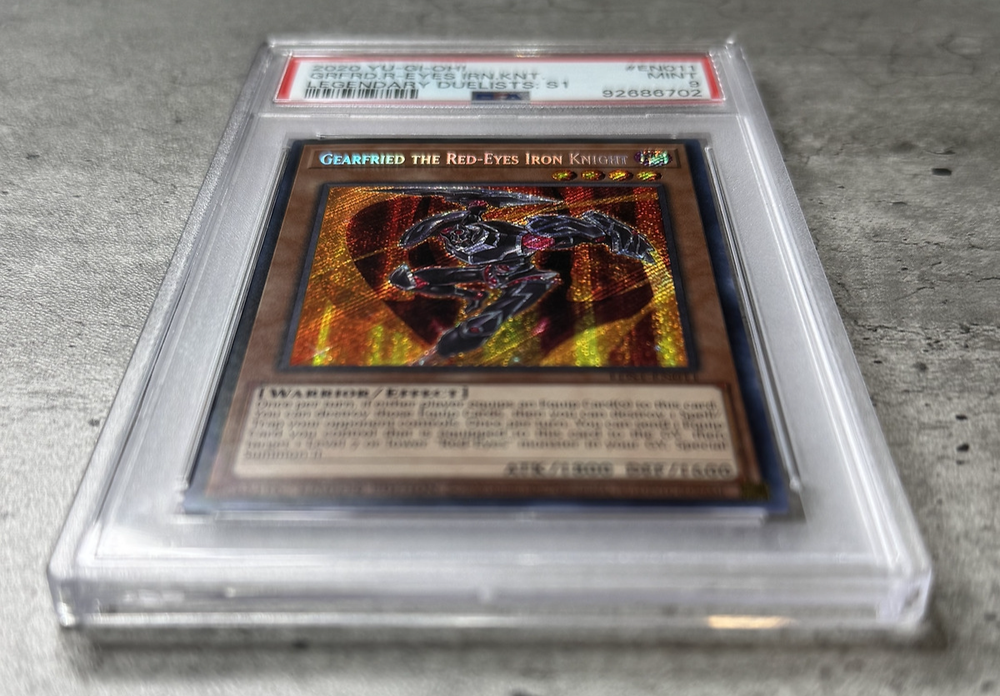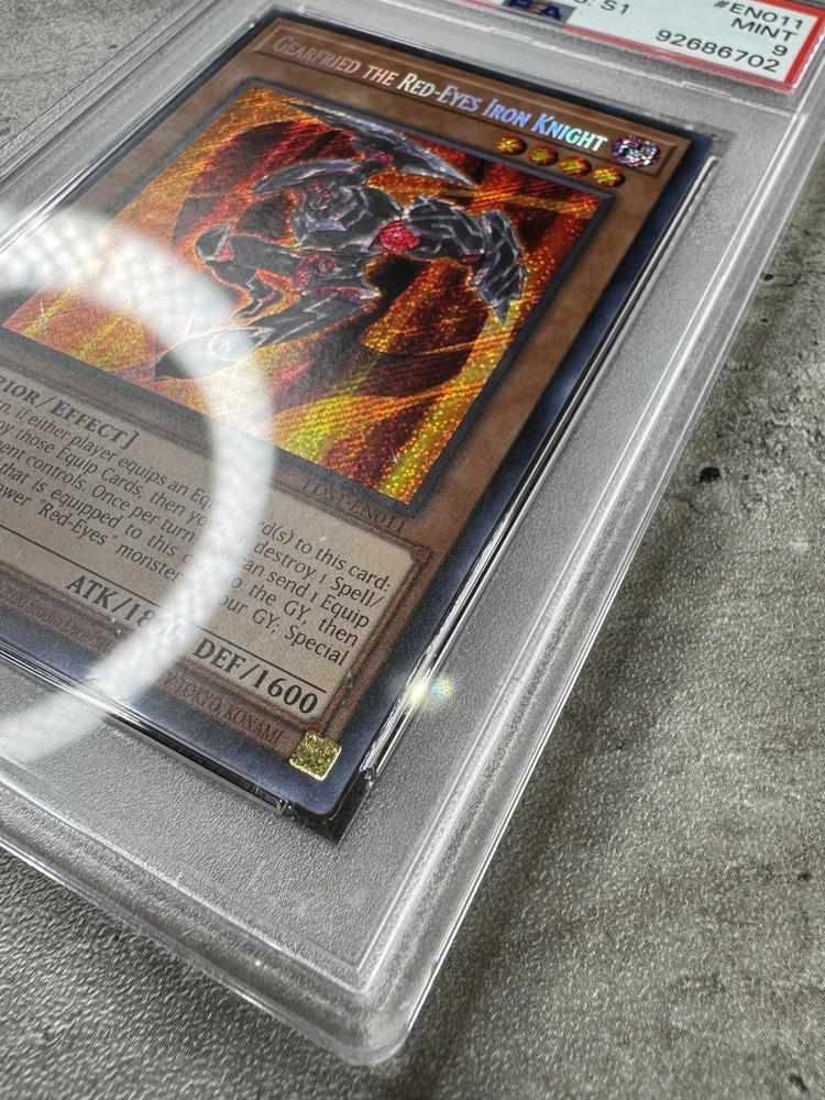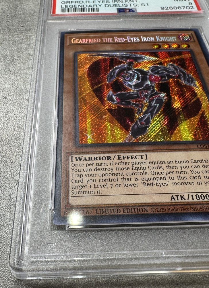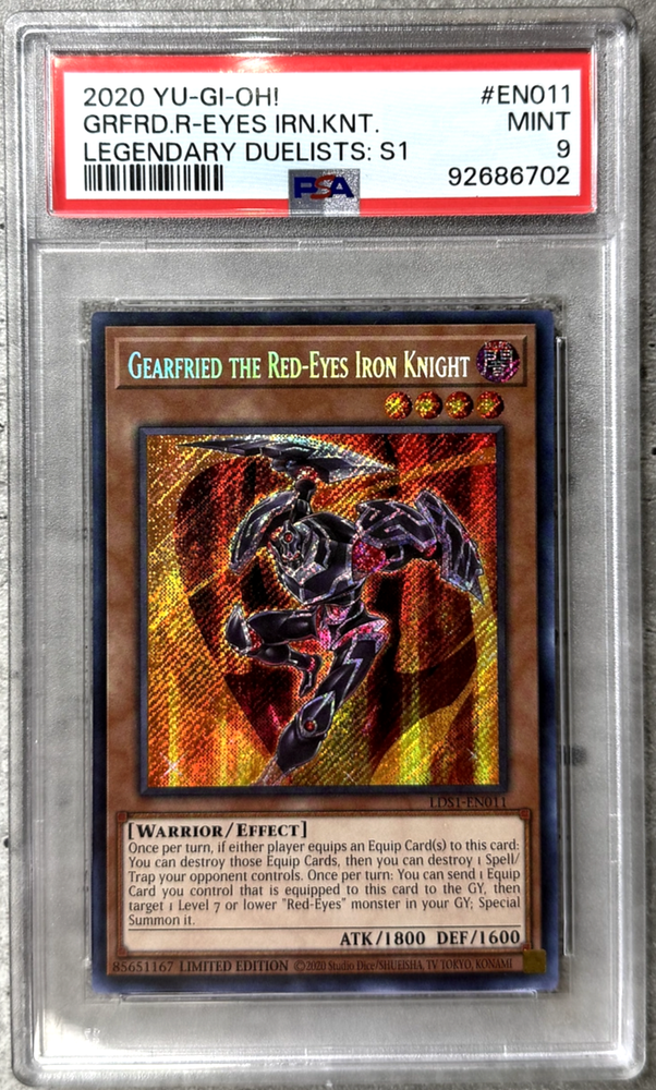 There is some light wear on the card's protective case. Please refer to the photos for details on slab. The card will come securely wrapped and packaged. A protective sleeve will come placed over the card’s case for added protection. Yugioh Card Gearfried The Red-Eyes Iron Knight Secret Rare PSA 9, LDS1-EN011 is a collectible card from the Legendary Duelists set featuring the character Gearfried The Red-Eyes Iron Knight. This English card by Konami has a Secret Rare holo finish and is ideal for fans of the Yu-Gi-Oh! TCG.