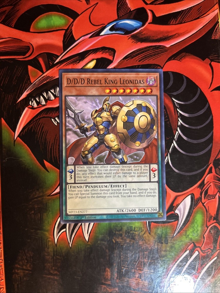 Yugioh D/D/D Rebel King Leonidas MP23-EN277 1st Edition. The card is pack fresh, Near Mint. The card is from the Yu-Gi-Oh!: 25th Anniversary Tin: Dueling Heroes Mega Pack. Card will ship in a white envelope, in a penny sleeve and top loader. We thank you for your business! :) If you would like to buy cards in bulk for a discount, please send me a message with the cards you would like to purchase so we could work out a deal. *Prices are from PriceCharting.com at time of posting*