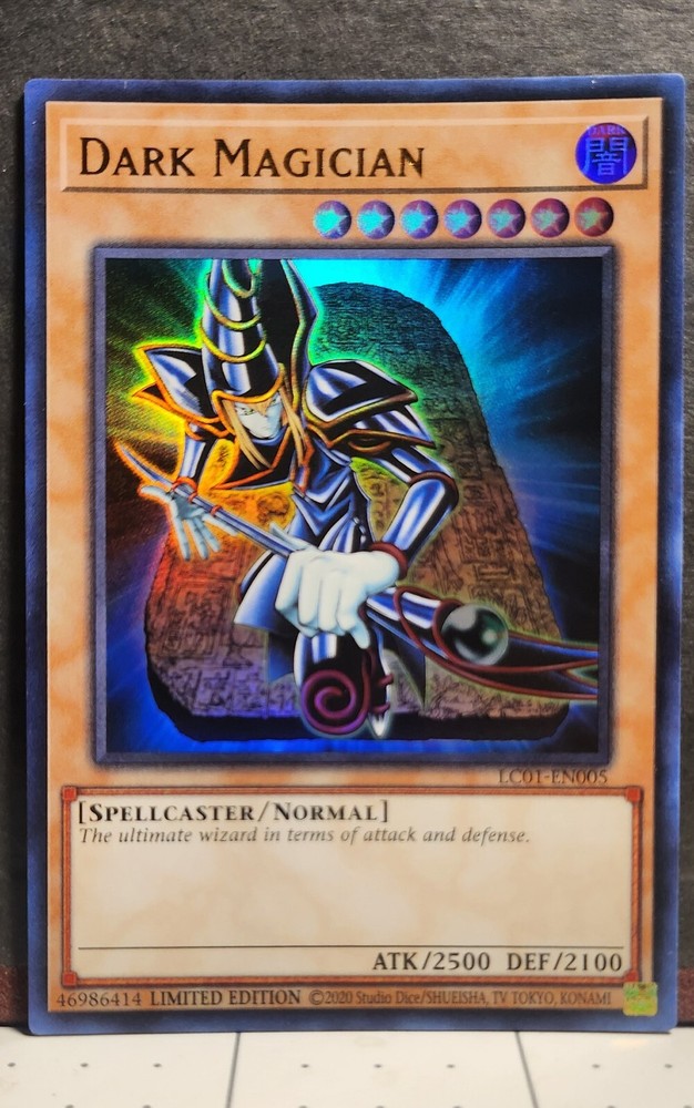 This is a Yu-Gi-Oh! TCG card featuring the Dark Magician character in a limited edition foil finish. The card is from the Yu-Gi-Oh! Legendary Collection set, released in 2020. It is an Ultra Rare 1st Edition card with the card number 005. The Dark Magician is a Spellcaster monster card associated with characters Yami Yugi and Yugi Muto in the Yu-Gi-Oh! franchise.