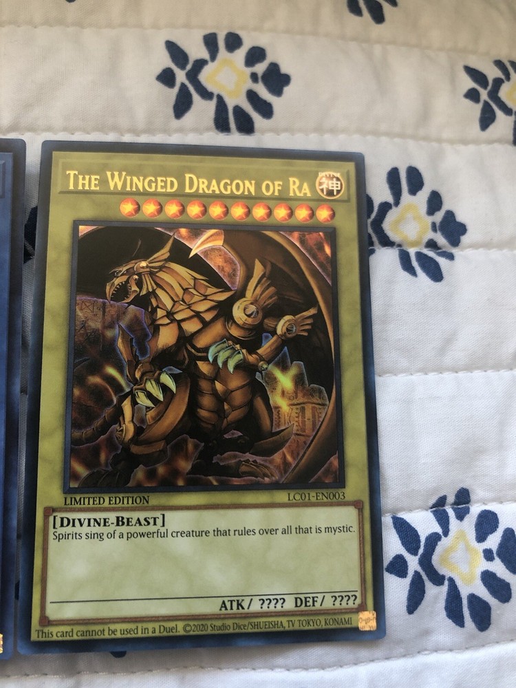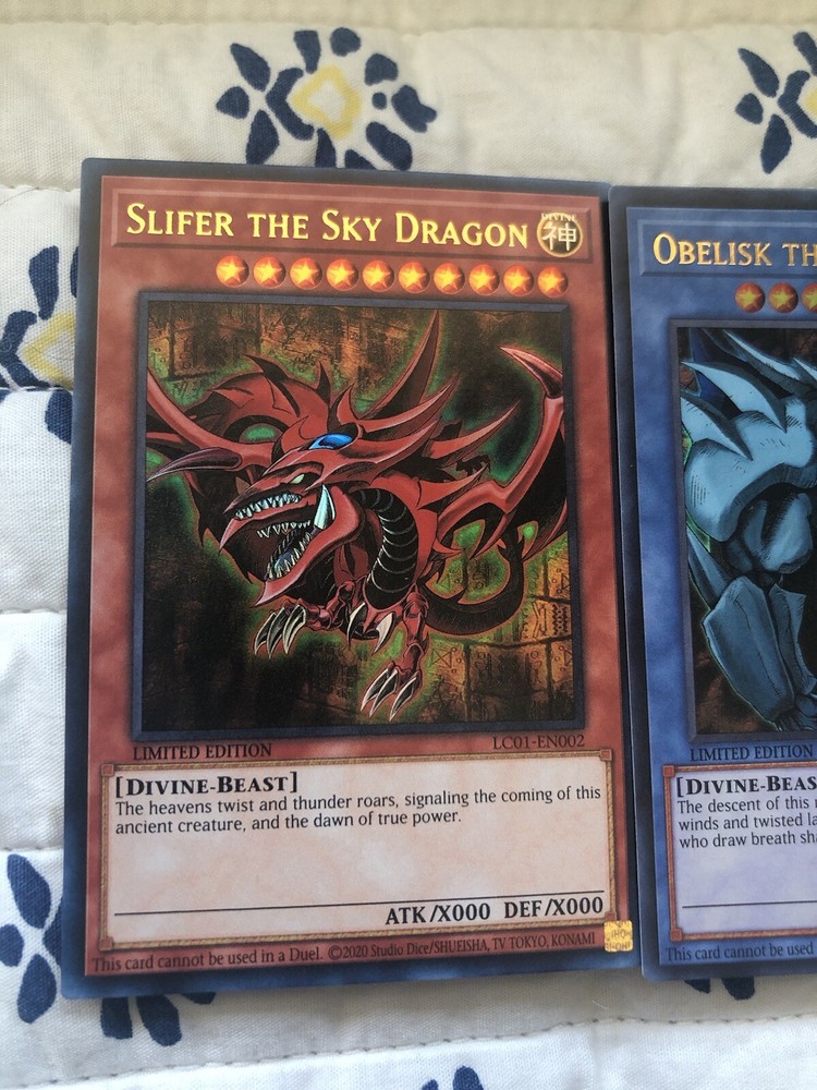 Up for sale is a limited edition set of three Yugioh Egyptian God Cards: Slifer, Obelisk, and Ra. These ultra rare cards were manufactured by Konami in 1999 and are a must-have for any Yu-Gi-Oh! TCG collector. The cards are made of high-quality card stock material and feature a holo finish. The set includes the G03 card number and is in grade 10 condition. These God Cards are perfect for players and collectors alike, and make a great addition to any CCG collection. Don't miss your chance to own this rare and highly sought-after set of Yugioh Egyptian God Cards!