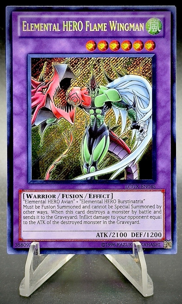 The Yugioh! Elemental HERO Flame Wingman card is a highly sought-after collectible in the Yu-Gi-Oh! trading card game. As a Secret Rare card from the Legendary Collection 2 set, it features the Warrior type monster with a Wind attribute and a Level of 6. This Fusion/Effect Monster card, with the card number LCGX-EN045, is named Elemental HERO Flame Wingman and is part of the Unlimited Edition. With its unique design and abilities, this card is a valuable addition to any Yu-Gi-Oh! collection for fans and collectors alike. Never played. The card pictured is the card you will receive. Thank you!