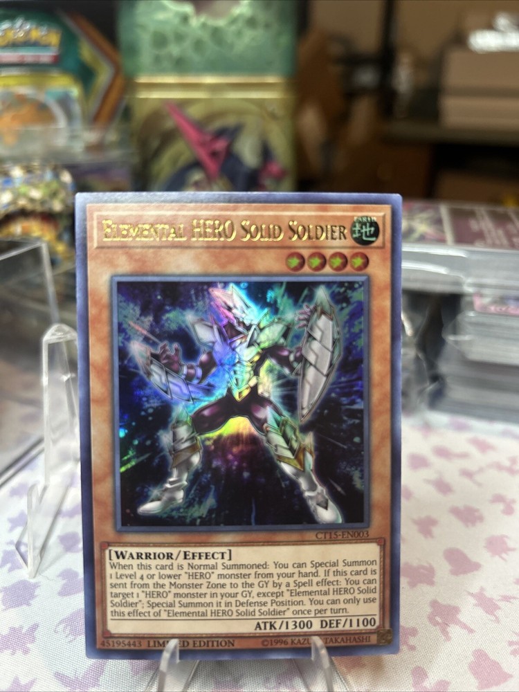 This Yu-Gi-Oh! TCG card is a must-have for collectors and players alike. The Elemental HERO Solid Soldier card is an Ultra Rare CT15 card that is sure to impress. With its striking design and powerful abilities, this card is a valuable addition to any collection. The card features the iconic hero character from the Yu-Gi-Oh! universe and is perfect for fans of the game. Whether you are a seasoned player or just starting out, this card is sure to provide hours of entertainment. Don't miss your chance to own this rare and sought-after card.