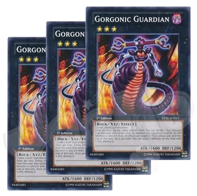 Gorgonic Guardian x 3 1st Edition The cards are in NM condition. Cards will be placed in a sleeve and top loader for security. Also will include a free Holographic card which can be Super, Ultra, Secret, etc! Card Information LVAL-EN051 - 1st Edition Legacy of the Valiant