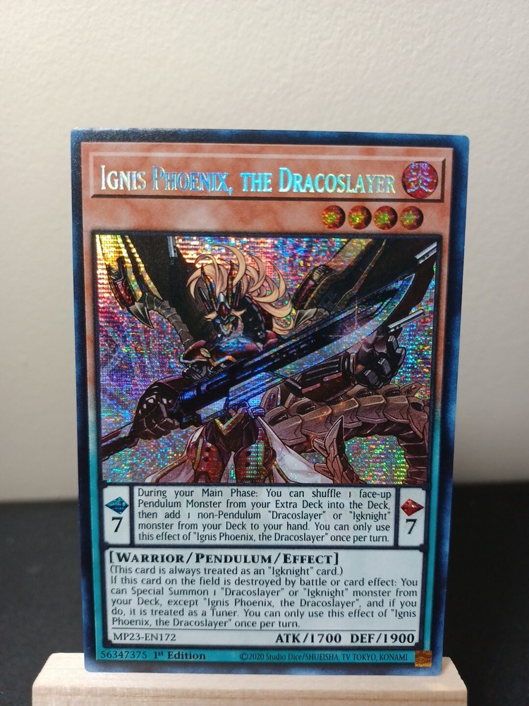 | Card Text | Pendulum Effect During your Main Phase: You can shuffle 1 face-up Pendulum Monster from your Extra Deck into the Deck, then add 1 non-Pendulum "Dracoslayer" or "Igknight" monster from your Deck to your hand. You can only use this effect of "Ignis Phoenix, the Dracoslayer" once per turn. Monster Effect (This card is always treated as an "Igknight" card.) If this card on the field is destroyed by battle or card effect: You can Special Summon 1 "Dracoslayer" or "Igknight" monster from your Deck, except "Ignis Phoenix, the Dracoslayer", and if you do, it is treated as a Tuner. You can only use this effect of "Ignis Phoenix, the Dracoslayer" once per turn. |