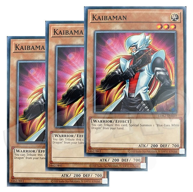 Kaibaman x 3 You will received 3 cards are they are in NM condition. Also will include a free Holographic card which can be a rarity of Super, Ultra, Secret, etc! Card Information You can Tribute this card; Special Summon 1 "Blue-Eyes White Dragon" from your hand. (Disclaimer: This card features a 2020 Copyright date.) Number: LDK2-ENK03 Rarity: Common