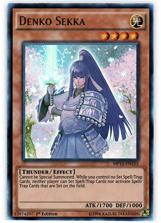 You are bidding on: Yugioh! Denko Sekka - MP15-EN155 - Ultra Rare - 1st Edition Condition: Condition: Lightly Played | Language: English All photos are stock, unless mentioned otherwise. Card edition, rarity, etc. are listed in the title and description. Cards are in English unless otherwise stated in title or description. Items will be shipped within 1 business day upon receiving cleared payment. We ship Monday through Saturday in order to get the item(s) to you as quickly as possible Before leaving neutral or negative feedback, please contact us beforehand so we can discuss the issue. Feel free to message me with any questions you have regarding this auction or my policies. Shipping Options: USPS Mail - $0.99 Orders $29.99 (exc. sales tax) and under will be sent in a white envelope in a card saver + soft sleeve using eBay's Standard Envelope tracking service. Orders $30.00 (exc. sales tax) and over will be sent with free USPS tracking information w/ toploader + soft sleeve. Priority Mail - $9.99 2-3 Day shipping Orders will be shipped in a flat rate envelope in a toploader + soft sleeve. Priority Express Mail - $29.99 1-2 Day shipping Orders will be shipped in a flate rate envelope in a toploader + soft sleeve. *All orders over $100 will be sent with free insurance. All orders over $250 will be sent with free insurance and signature confirmation.* Card Grading: Near Mint (NM) - Cards with this grade will show minimal to no wear from shuffling, play or handling and can have a nearly unmarked surface, crisp corners and unblemished edges outside of a few minimal flaws. Holographic cards are more scrutinized than non-holo cards. Lightly Played (LP) - Cards with this grade may have a few dings, light playwear and/or edgewear. A few surface scratches are acceptable. A crease or bend is acceptable if it is less than approximately 1/2 inch in size and is only visible on one side. Moderately Played (MP) - Cards with this grade may have dings, playwear and/or edgwear, 1 or 2 creases or bends that do not go through the length of the card. Cards may have a 1 or 2 deep scratches. Heavily Played (HP) - Cards with this grade may have dings, playwear and/or edgwear, creases or bends that may go the length of the card, markings and/or coloring, tears on the edges. Despite being the lowest of grading, these cards are still tournament legal. If you receive a card not in the stated condition, please contact us to return the item for a full refund. Thank you for buying.