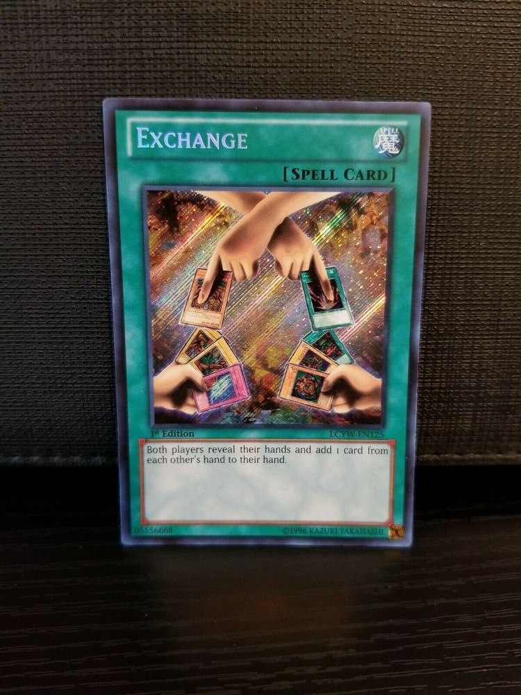 Card Set: First Edition - Legendary Collection 3: Yugi's World Card : Exchange - LCYW - EN125 Condition: Near Mint *** CARD PURCHASED WILL BE THE EXACT CARD PICTURED.*** Grading Scale: Mint Condition: Nearly Flawless - Very Slight (If Any) Imperfections Near Mint Condition: Some Light Scratches and/or Slight Whiteness (Edge-Wear) Lightly Played: Scratches and/or Whiteness (Edge-Wear) becoming Prominent Played: Prominent Scratches and Whiteness (Edge-Wear) - May have Bend(s) / Crease(s)