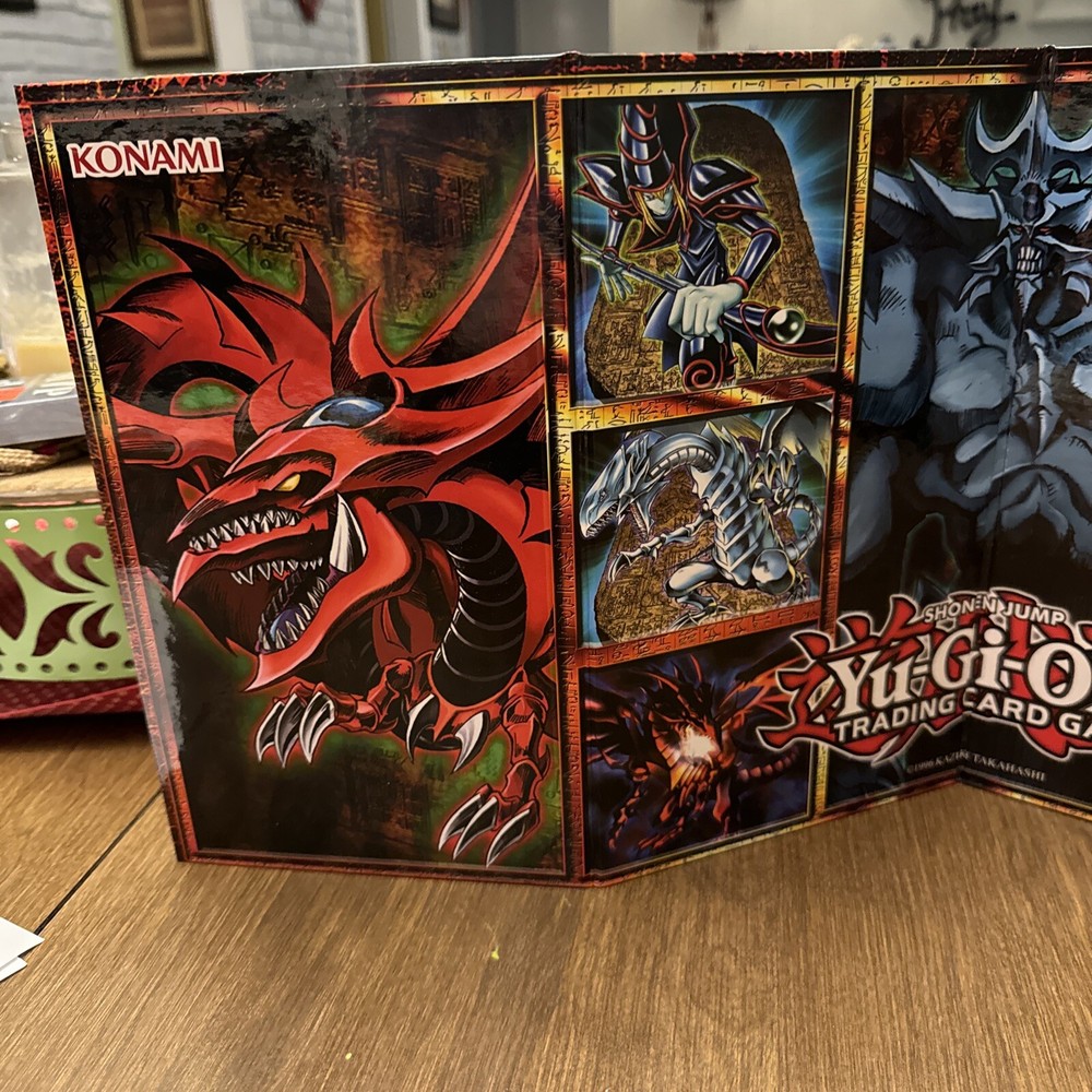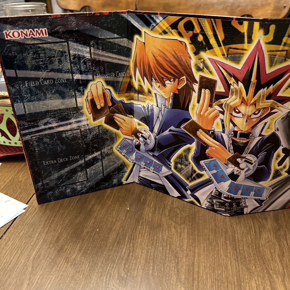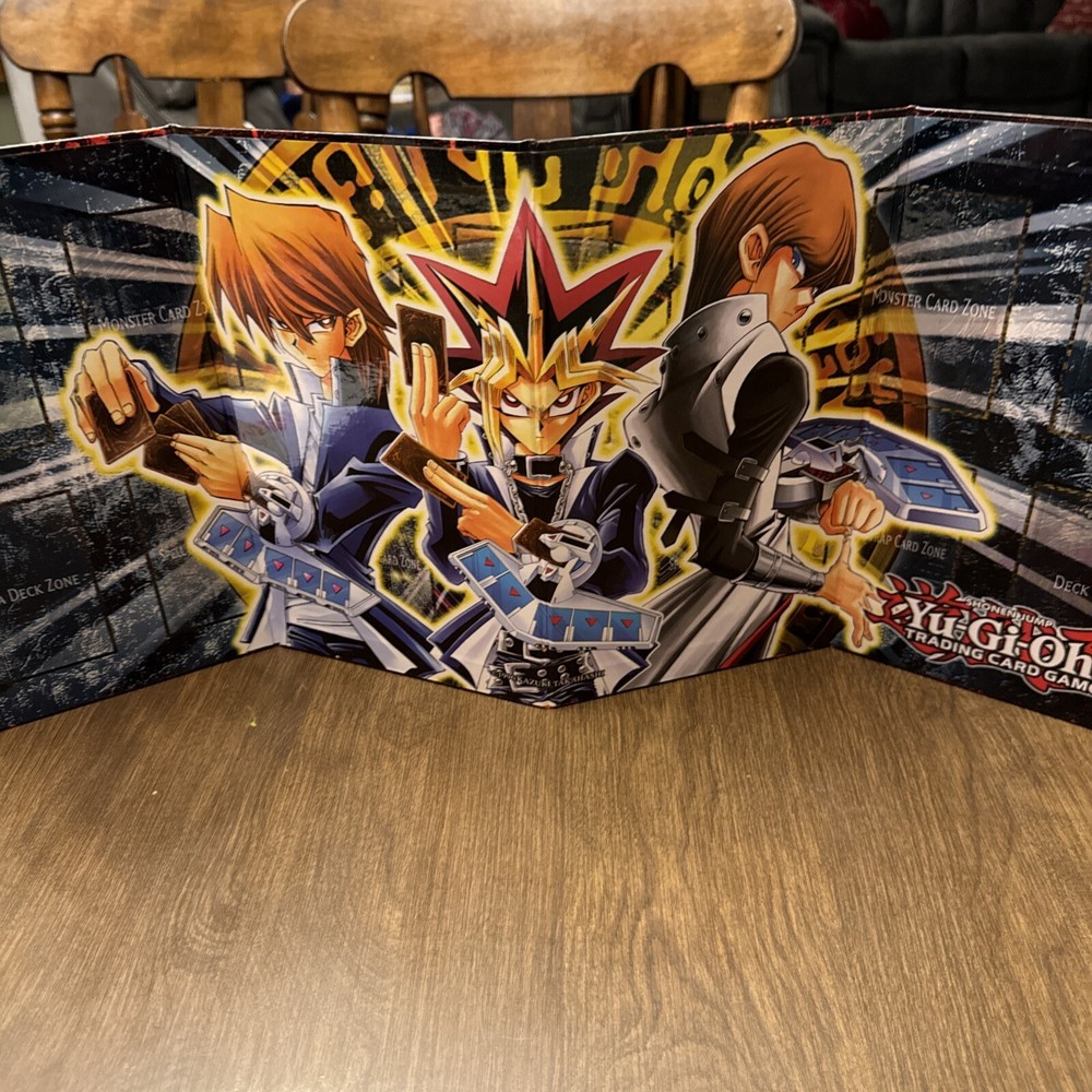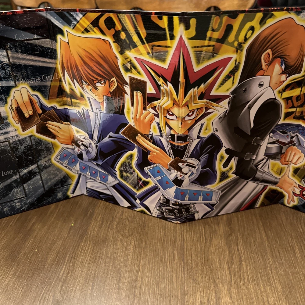 This Yu-Gi-Oh! TCG playmat features the legendary characters Yami Yugi, Seto Kaiba, and Yugi Muto from the popular TV show. The cardboard edition playmat is perfect for collectors and fans of the franchise. The standard playmat type is ideal for protecting your cards during gameplay. The Konami brand CCG playmat is designed for the Yu-Gi-Oh! TCG and is part of the Kaiba set. It is a must-have for any fan of the game. This playmat is perfect for those who want to add a touch of nostalgia to their collection.