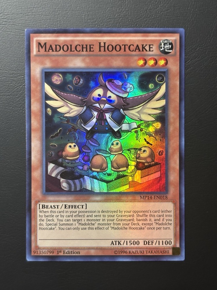 This is the Madolche Hootcake card from the Yu-Gi-Oh! TCG game. It is a Super Rare card with the 1st edition. The card is part of the 2014 Mega Pack set and has the card number MP14-EN018. The card is in English and manufactured by Konami. The card features an Effect monster card. This collectible card is perfect for any Yu-Gi-Oh! fan or collector. Condition of card is as pictured and can be most accurately categorized as very lightly played to near mint This card will be in a penny sleeve and placed in a toploader. The toploader will be enclosed by computer paper and some tape in an eBay standard envelope and shipped with the associated service. Purchases made earlier in the day can be packaged and shipped out on the same day.