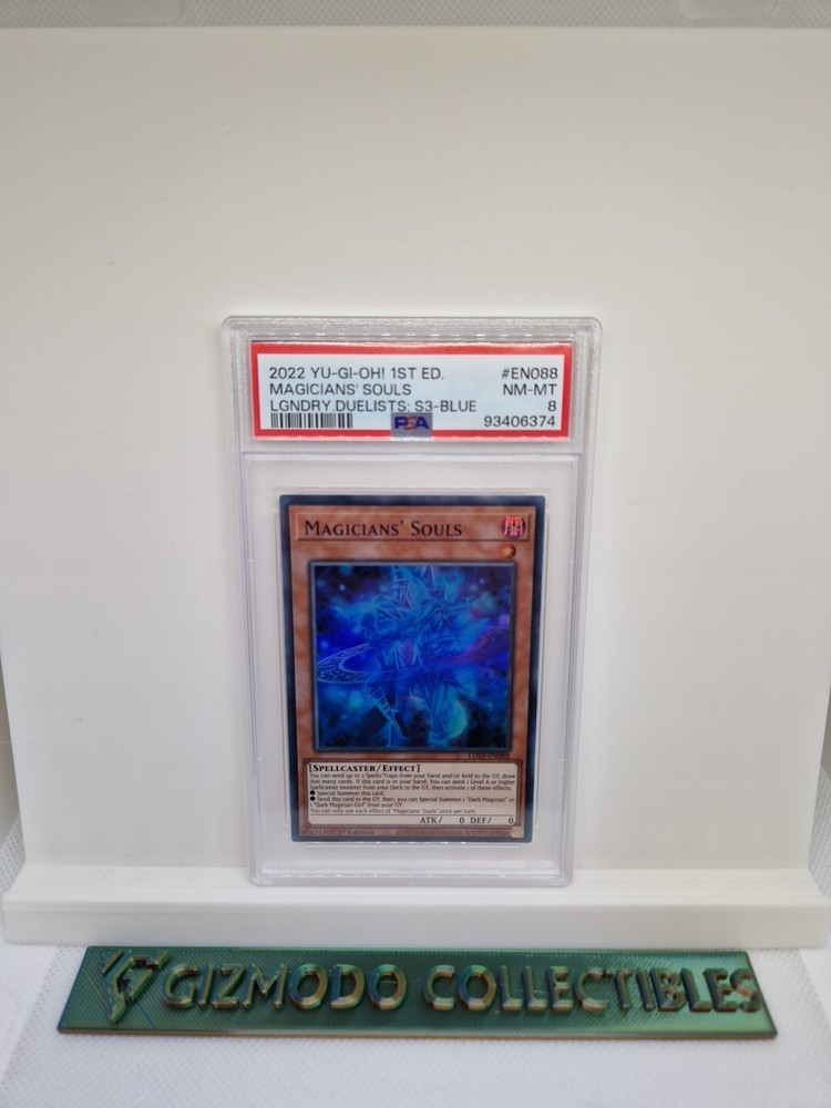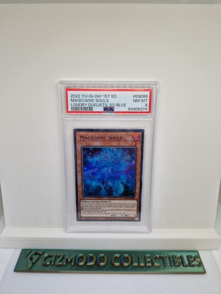 This Yugioh! card is a must-have for collectors and players alike. With its Ultra Rare status and 1st Edition PSA 8 Lds3 Blue grade, it's a valuable addition to any collection. The card features the character Magician's Souls from the Legendary Duelists: Season 3 set and is manufactured by Konami. The card is perfect for those who play the Yu-Gi-Oh! game, with its Spellcaster creature type and Yugioh card type. Its card number is EN088 and it's from the 2022 year manufactured. This card is sure to impress anyone who sees it, with its stunning blue colour and legendary status.