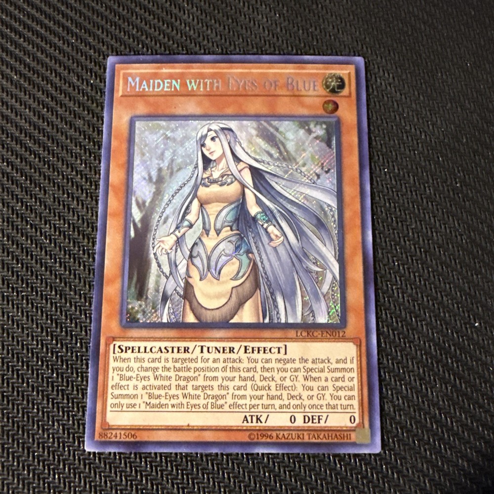 | Card Text | When this card is targeted for an attack: You can negate the attack, and if you do, change the battle position of this card, then you can Special Summon 1 "Blue-Eyes White Dragon" from your hand, Deck, or Graveyard. During either player's turn, when a card or effect is activated that targets this face-up card: You can Special Summon 1 "Blue-Eyes White Dragon" from your hand, Deck, or Graveyard. You can only use 1 "Maiden with Eyes of Blue" effect per turn, and only once that turn. |