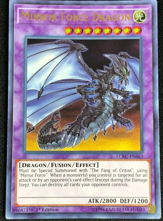 This Yugioh Mirror Force Dragon is a fantastic addition to any collector’s deck! The LCKC Ultra Rare 1st Edition looks amazing in LP condition—slight wear but still vibrant and crisp. Seller ships fast and communicates well, making the buying experience smooth. Highly recommend for serious players or fans of rare cards!