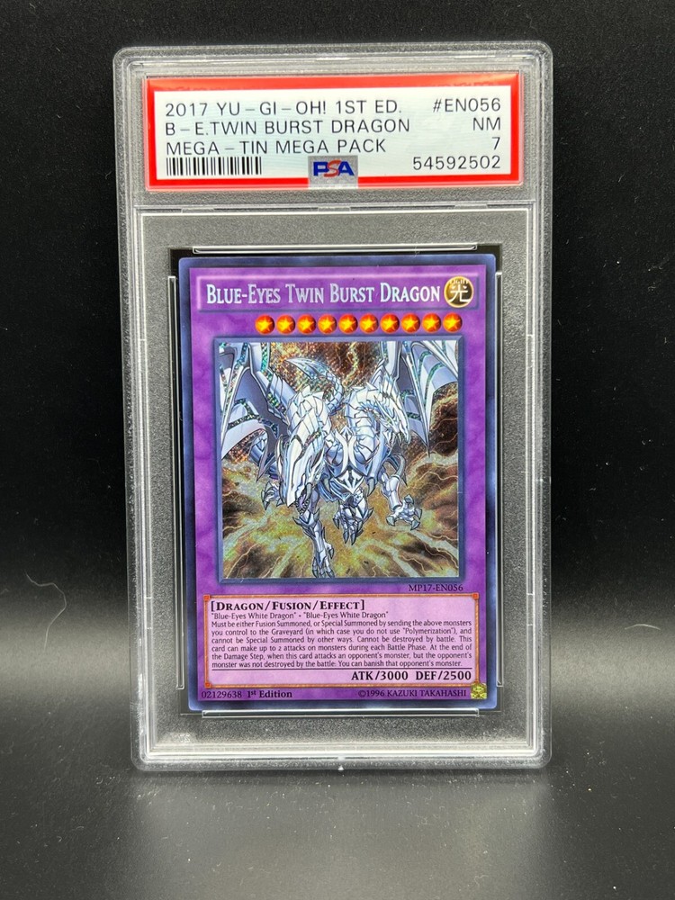 You are bidding on a Yugioh PSA 7 NM Blue-Eyes Twin Burst Dragon MP17-EN056 Secret Rare 1st Edition from the 2017 Mega Tins!! This card has been graded as NM - a 7 - by PSA!!! An excellent addition to any collection! We are a US Seller! Shipping on all items is FREE inside the United States. For international orders we use eBay's Global Shipping Program. All shipping charges, taxes, fees, etc. for international orders are calculated and collected by eBay at checkout.! All PSA cards will be shipped in a padded envelope or appropriately sized padded box, with a graded card sleeve surrounding the PSA Case. For orders over $250, please be advised that signature confirmation is required. For any questions regarding shipping or otherwise, please contact us prior to purchase. Please allow 2-3 business days handling time. Make sure to check out our other listings for all of your favorite Trading Card Games! Thanks for shopping at Yeti Gaming!