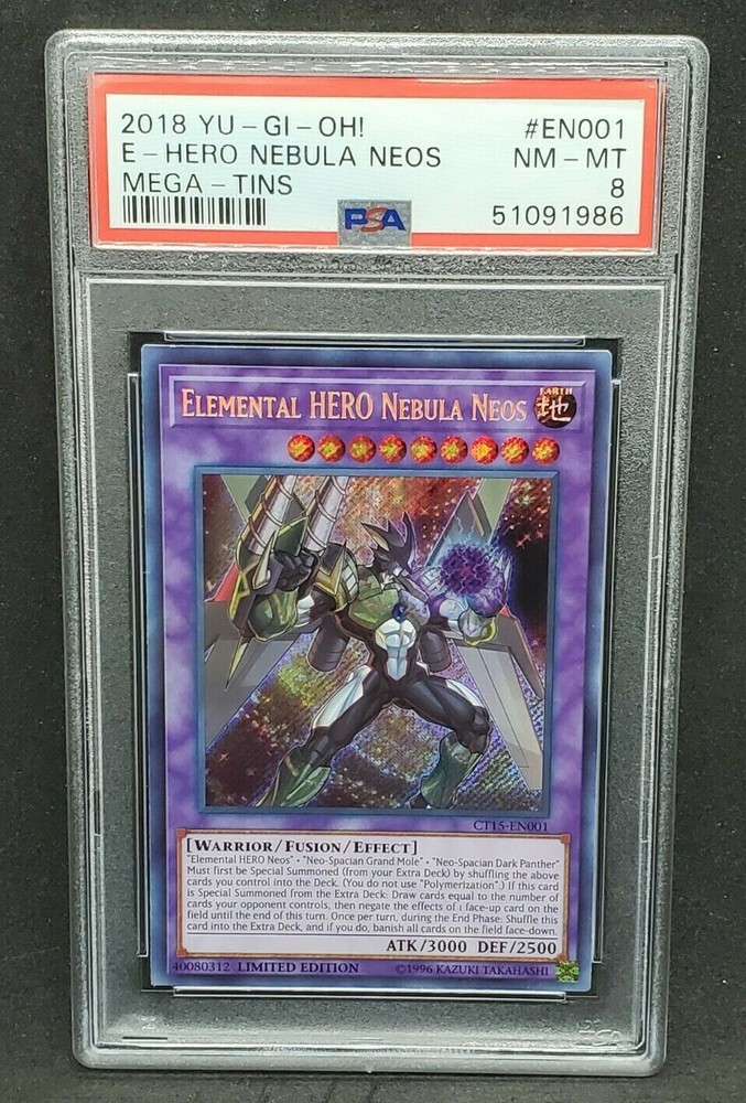 You are bidding on a Yugioh PSA 8 NM-MT Elemental HERO Nebula Neos Secret Rare Card# CT15-EN001 !!! This card has been graded as NM-MT - an 8 - by PSA!!! An incredible addition to any collection! Shipping is FREE on this item in the United States! You will receive the exact item pictured in the listing - for more pictures or if you have any questions, don't hesitate to contact us! All cards will be shipped in sleeves, Top Loaders (or similar), and a padded envelope or appropriately sized padded box for safe arrival. In this case, the PSA-cased card will be in a graded card sleeve as well. For orders over $250, please be advised that signature confirmation is required. Please allow 2-3 business days handling time. Make sure to check out our other listings for all of your favorite Trading Card Games! Thanks for shopping at Yeti Gaming!
