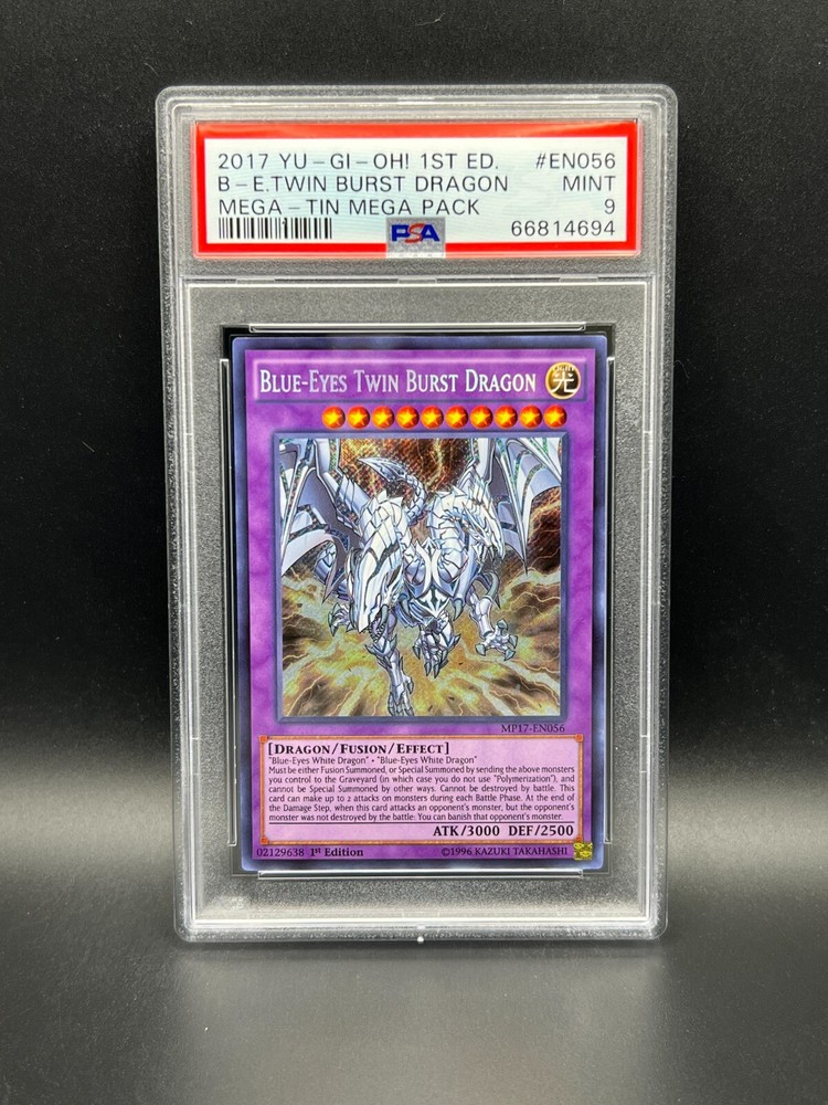 You are bidding on a Yugioh PSA 9 MINT Blue-Eyes Twin Burst Dragon MP17-EN056 Secret Rare 1st Edition from the 2017 Mega Tins!! This card has been graded as MINT - a 9 - by PSA!!! An excellent addition to any collection! Shipping is FREE on this item in the United States! All PSA cards will be shipped in a padded envelope or appropriately sized padded box, with a graded card sleeve surrounding the PSA Case. For orders over $250, please be advised that signature confirmation is required. For any questions regarding shipping or otherwise, please contact us prior to purchase. Please allow 2-3 business days handling time. Make sure to check out our other listings for all of your favorite Trading Card Games! Thanks for shopping at Yeti Gaming!