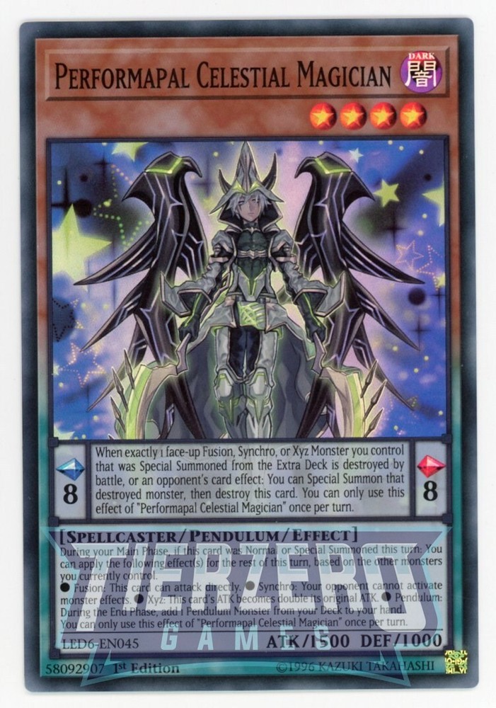 Yugioh Performapal Celestial Magician LED6-EN045 Super Rare 1st Edition NM/LP Near Mint Condition - Straight from pack to sleeve. Due to manufacturing there can be inconsistencies in card condition. TierZero Games will always do our utmost to offer the most competitive prices on the market both on eBay and on our website. Card picture is an example of product - not the exact card you will receive. Please feel free to contact us with any questions or queries and thanks for shopping at TierZero Games.