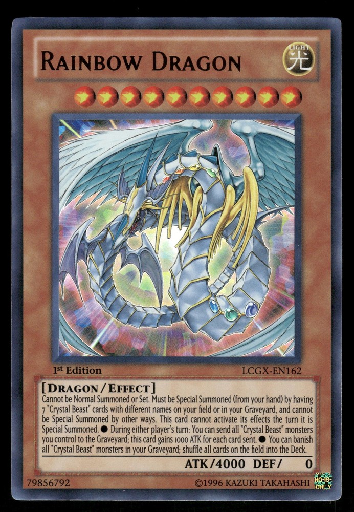 Rainbow Dragon LCGX-EN162 Yugioh! Legendary Collection 2 Ultra Rare Yugioh! TCG. If multiple cards are listed, you may not receive the exact one in the photos. All copies are in the same condition. Condition is as shown. Please feel free ask if you'd like to see more photos! All card orders packaged with care using a penny sleeve, top loader and a team bag. Singles up to $20 will be shipped in a PWE, $20+ will be shipped in a Bubble Mailer, anything fragile/sealed (depending on the product) will be shipped in a box. All orders are shipped out within 24 hours.