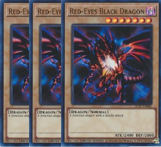 Red-Eyes Black Dragon x 3 Limited Edition - Ultra Rare You will receive 3 cards and they are in NM condition. Also will include a free Holographic card which can be a rarity of Super, Ultra, Secret, etc! Card Information A ferocious dragon with a deadly attack. Number: LC01-EN006 Rarity: Ultra Rare