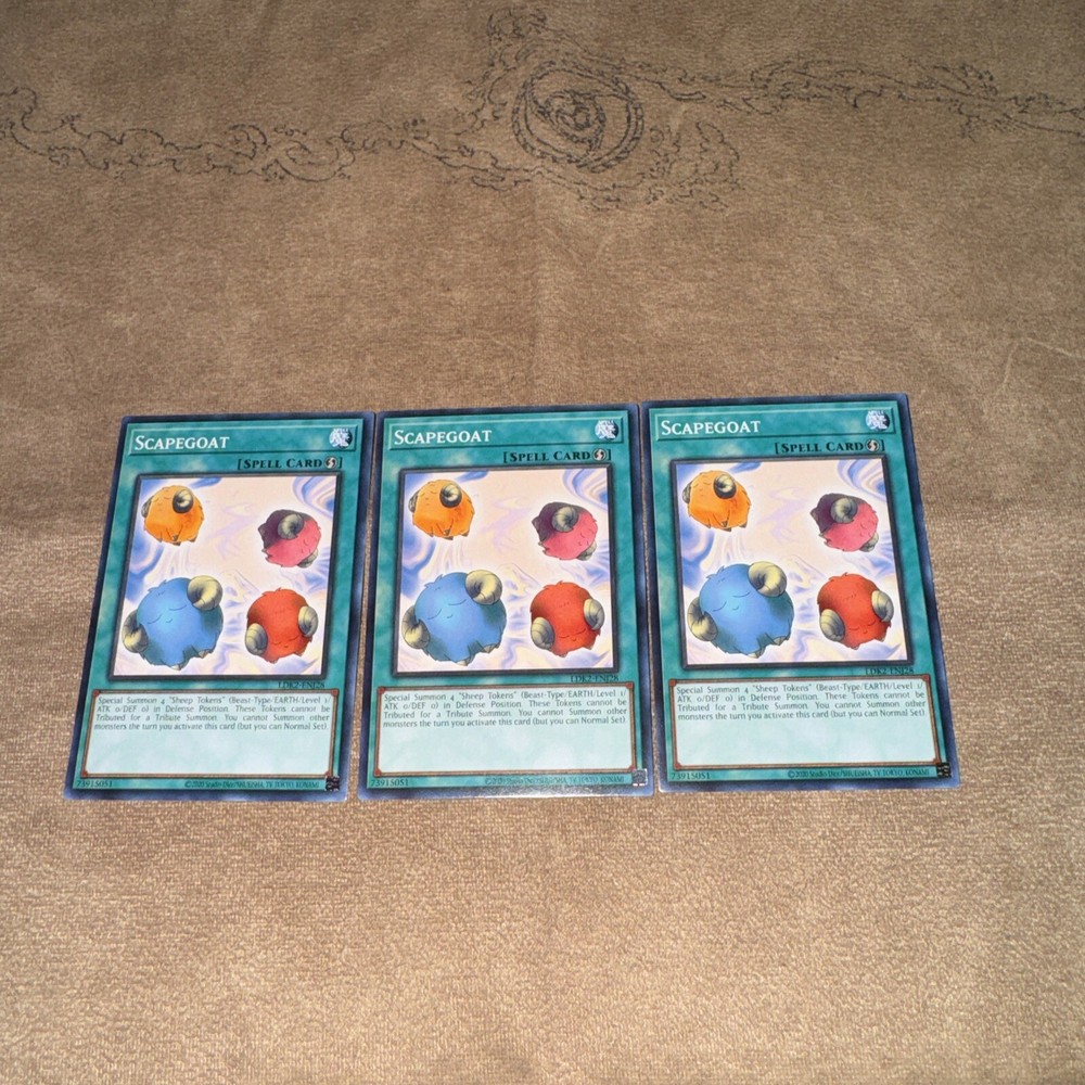This Yu-Gi-Oh! TCG collectible card game individual card is a playset of three Scapegoat cards, with the LDK2-ENJ28 code. The cards are brand new and in near mint to mint condition, making them a valuable addition to any collection. The unlimited features of these cards ensure their versatility in gameplay. Perfect for collectors or players alike, these cards are a must-have for any Yu-Gi-Oh! TCG fan.