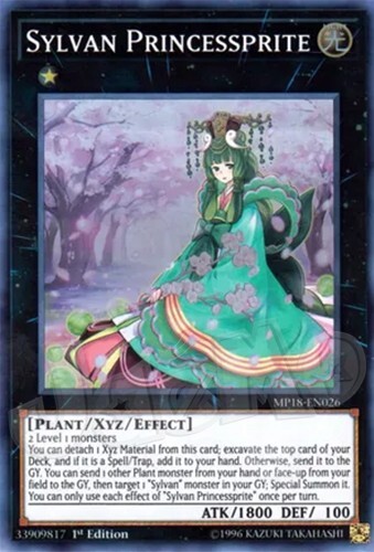 Sylvan Princessprite 1st Edition - Super Rare The card is in NM condition. Also will include a free Holographic card which can be a rarity of Super, Ultra, Secret, etc! Card Information 2 Level 1 monsters You can detach 1 Xyz Material from this card; excavate the top card of your Deck, and if it is a Spell/Trap Card, add it to your hand. Otherwise, send it to the GY. You can send 1 other Plant-Type monster from your hand or face-up from your field to the GY, then target 1 "Sylvan" monster in your GY; Special Summon it. You can only use each effect of "Sylvan Princessprite" once per turn. Number: MP18-EN026 Rarity: Super Rare