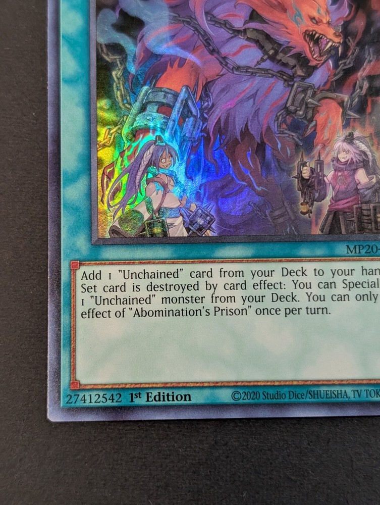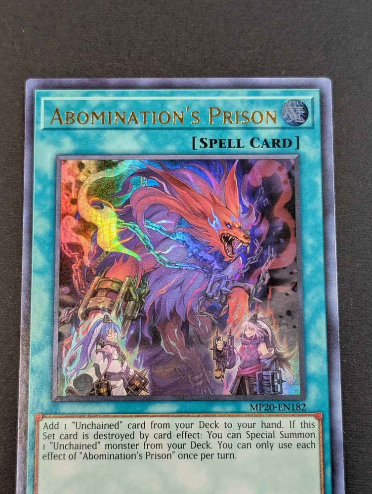 This Ultra Rare Abomination's Prison is a must-have for any serious Yu-Gi-Oh! player—its stunning holographic finish makes it stand out, and its strategic value in blocking opponent Spells is unbeatable. The 1st Edition stamp adds collector appeal, and the card's crisp condition ensures it's ready for play or display. A fantastic addition to any deck or collection!