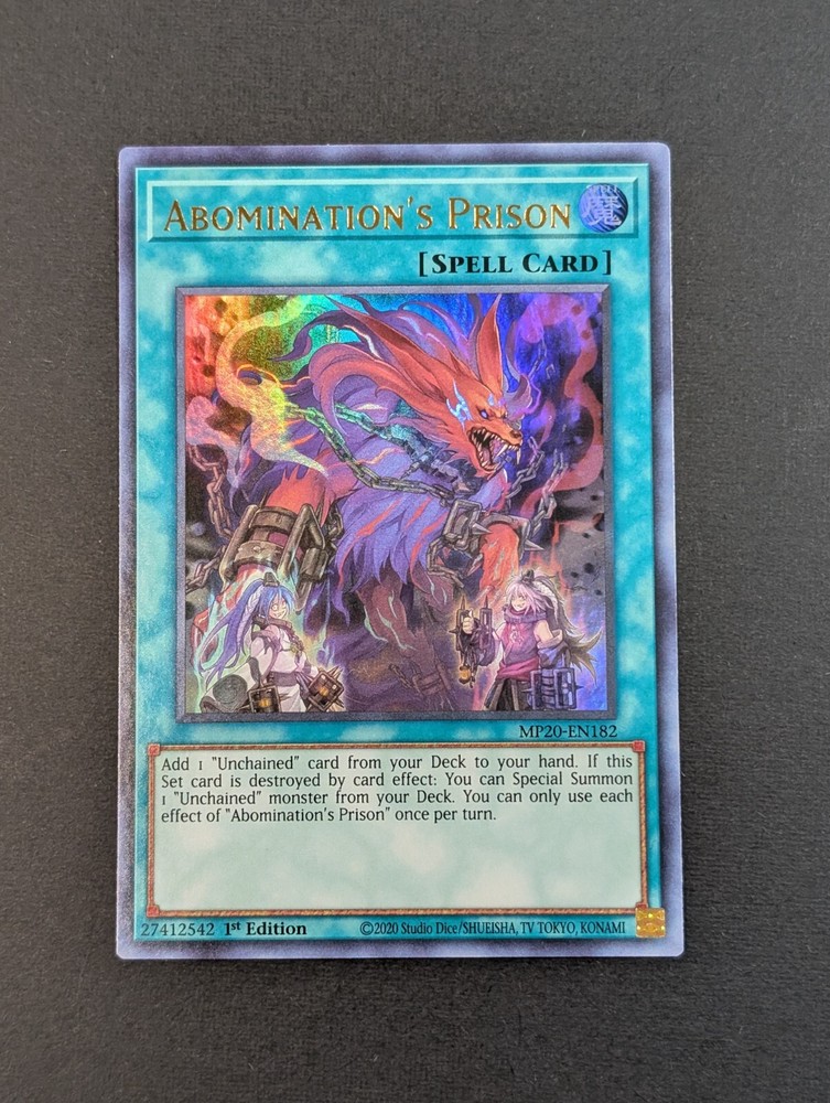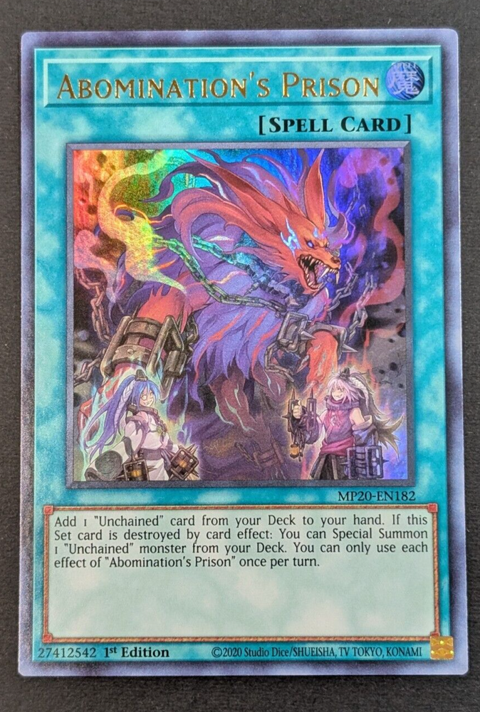 Elevate your Yu-Gi-Oh! TCG collection with the formidable "Abomination's Prison" card, a Spell card from the 2020 Mega Tin set. The Ultra Rare card, numbered MP20-EN182, boasts an impressive holographic finish that catches the light, accentuating its 1st Edition status. As a critical piece for any player, it serves as a barrier to your opponent's strategies, denying them the chance to unleash their Spell cards. Crafted by Konami, this card is printed in English and designed for the age level of 8 and above. "Abomination's Prison" is made from high-quality card stock and maintains a pristine state, ready to be a mainstay in your next duel. With its standard card size, it fits seamlessly into your deck, ensuring you can harness its effect to its fullest potential. Thank you for Visiting my store you can browse the rest of my items for sale here : https://www.ebay.ca/str/dragontreegames I offer combined shipping on all my trading cards for international customers to help offset shipping costs
