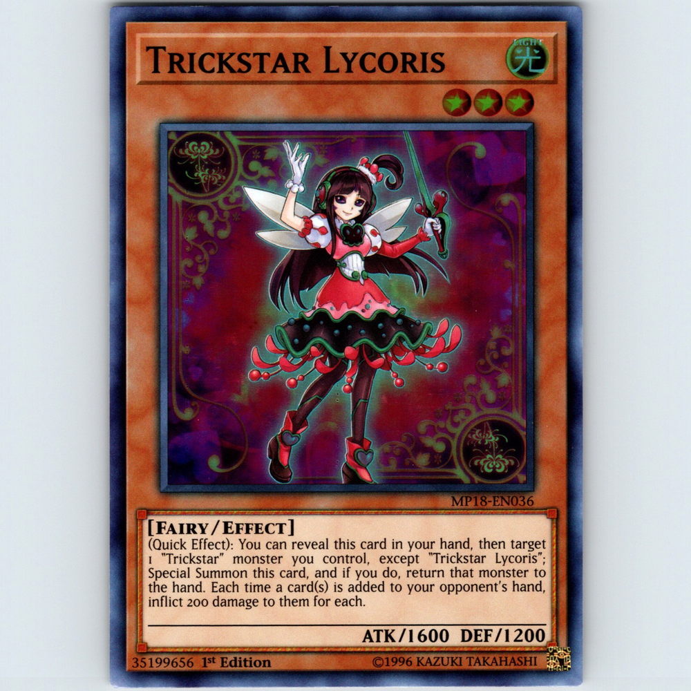 | Card Text | (Quick Effect): You can reveal this card in your hand, then target 1 "Trickstar" monster you control, except "Trickstar Lycoris"; Special Summon this card, and if you do, return that monster to the hand. Each time a card(s) is added to your opponent's hand, inflict 200 damage to them for each. |